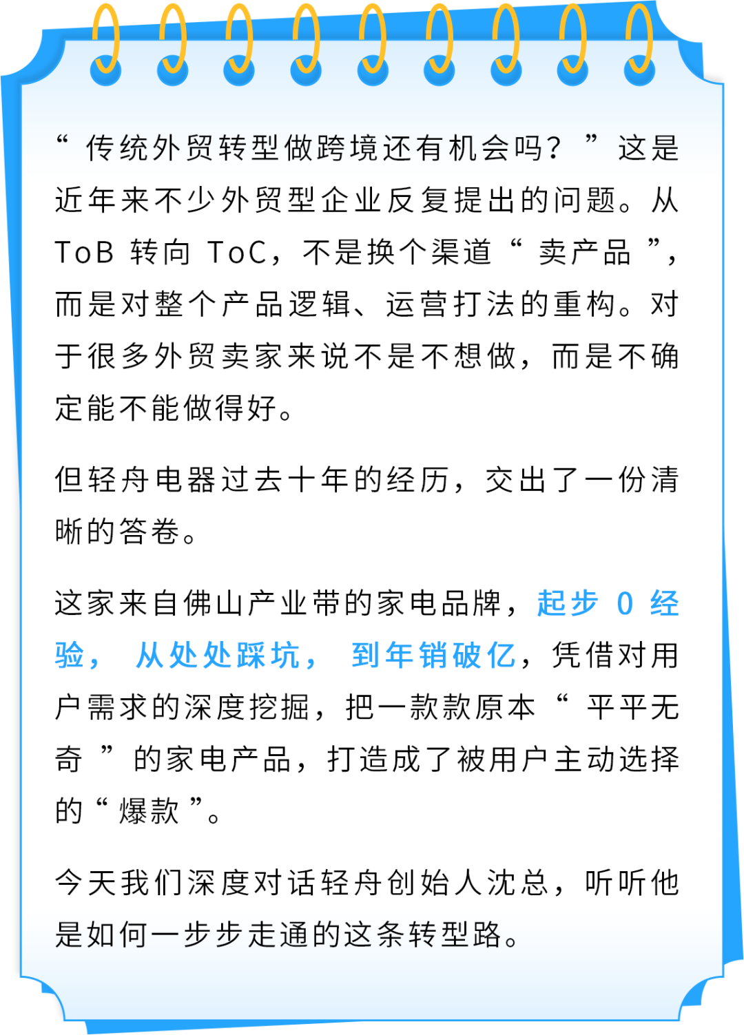 从出海初期处处碰壁,到年销破亿,轻舟转型出海的这10年成长路,对许多正走在转型路上的传统外贸卖家来说,是一条值得借鉴的长期路径。转型出海任何时候都不会晚,找对节奏、补齐短板,相信会有越来越多的中国品牌在跨境这条路上走稳走远。