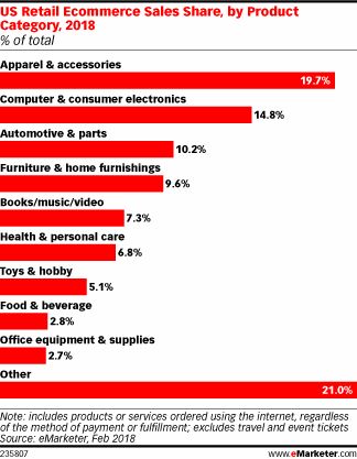 数据机构eMarketer的报告显示,当前美国在线零售行业最畅销的类目是服装配饰(19.7%),其次是计算机和消费电子产品,占14.8%。
