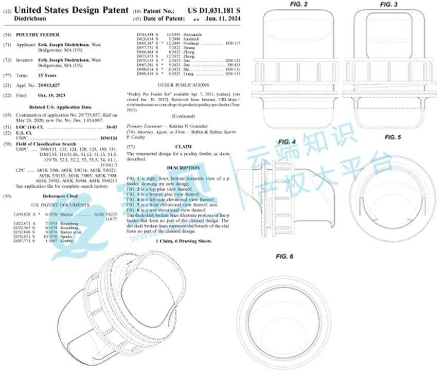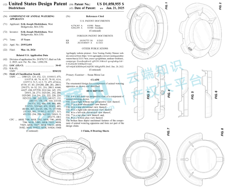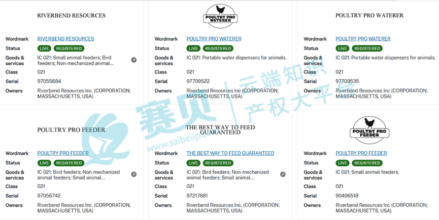案件处于密封状态,赛贝通过专业检索发现,原告Erik Joseph Diedrichsen在美国针对家禽养殖设备注册了多项外观设计专利。此外,原告还注册了多个与家禽喂养、供水相关的商标,主要涉及的商品服务类别是IC 021,像小动物及鸟类喂食器、便携式动物饮水器这类非机械化的动物用品都在其保护范围内。赛贝提醒,未经原告授权,切勿擅自使用这些受保护的知识产权,否则很可能面临侵权风险。