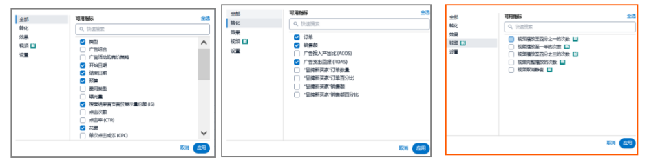 可选择自定义添加如下指标列,监测广告活动的多维度效果。