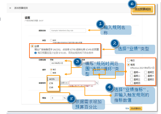 Tip:可以为一个广告活动设置多个规则。如果多个规则满足您设置的条件,那么我们将应用预算增加最多的规则。