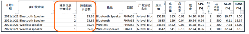 对于搜索词“Bluetooth Speaker”,您可以看到商品推广在当天产生的展示量排名,您处于第2名,这意味着有1位卖家在当天对该搜索词获得了更多商品推广展示量。
