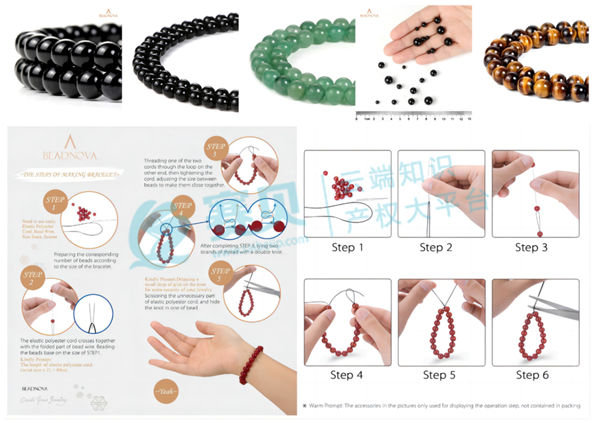 本案还涉及到一项版权,版权的图片内容为珠宝的局部图以及串珠的教程图,请注意不可以随意使用在产品包装及描述上,否则会有侵权风险。