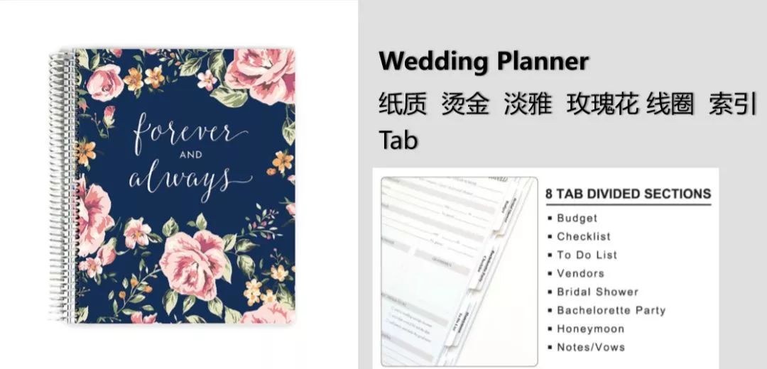 第五步:研究这些词背后,海外买家到底想看到什么样的产品。以Planner为例,顾名思义,是做计划的本子。那么可以尝试把产品属性做拆分,比如什么样的封面,怎样的装订,内页设计种类以及配件情况等,同时挖掘计划本的使用场景,比如是婚礼还是健身,又或者是财务预算。当这些分析清楚了,热门产品属性+热门场景,一款产品就具备了爆款基因。