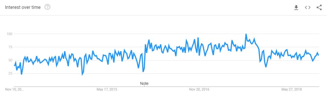 但在国外,Content marketing,是一个非常牛逼的,而且需求量巨大的市场。我们打开Google trends,发现内容营销在过去五年在市场中都是保持高位需求,如下图: