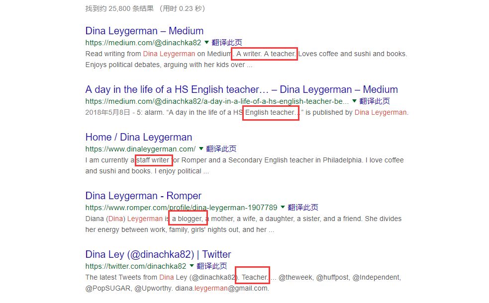 这个结果是比较好的,我们可以看到关于她的关键词基本都是“writer”,“teacher”等。图片也还可以,有清晰的照片,可以分辨出来哪个是她本人。