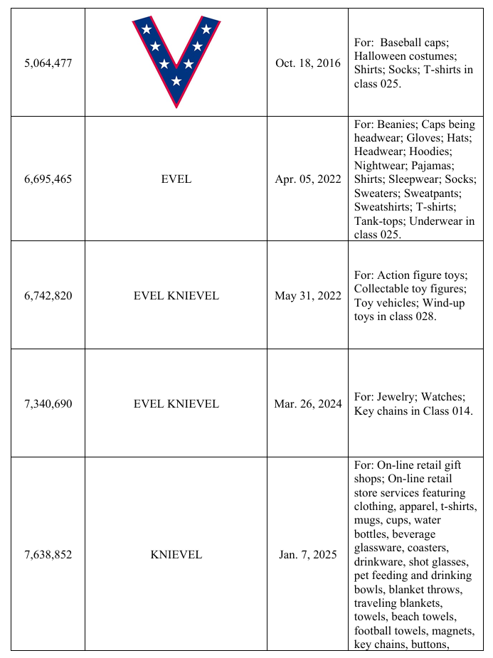 原告K AND K PROMOTIONS, INC.是一家根据内华达州法律组建的公司,其拥有Evel Knievel品牌及形象相关的商标。Evel Knievel是一位著名的特技表演者。原告注册了一系列与“Evel Knievel”相关的商标。