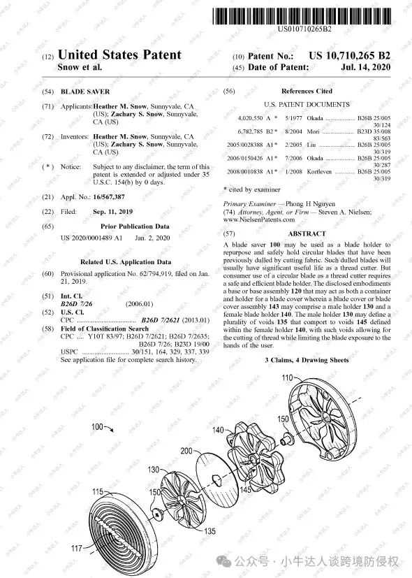 本次涉案专利虽被隐藏,但通过起诉书,可以了解到涉案专利与旋转刀片保护器有关。除了该案件所设计的专利外,原告旗下还有另一款相关的发明专利。
