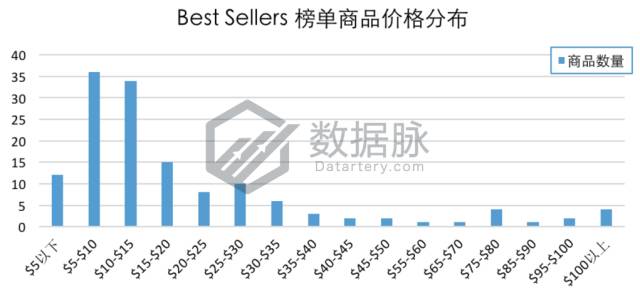 上周Kitchen & Dining品类Best Sellers榜单商品最高价$265.53,最低价$0.84,平均价格$23.36。骆探长(shujumai.com)发现,在上榜的商品中,价格 在$5.00-$10.00区间内的商品数量最多,占比达23.84%,另有22.52%的商品价格分布在$10.00-$15.00内;此外在上周登榜 Best Sellers 榜单的商品中,仅有4款商品超过$100,占比为2.65%。