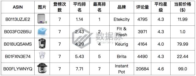 可以看到,在上周Kitchen & Dining品类的Best Seller榜单中排名前五中,骆探长(shujumai.com)发现,品牌Etekcity的多功能食品秤在一周内榜单榜单表现极为出色,在上周连续6次 登顶榜单,以1.14的平均排名荣膺综合排名首位;