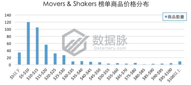上周Kitchen & Dining品类Movers & Shakers榜单商品最高价$265.53,最低价$0.01,平均价格$20.99。骆探长(shujumai.com)发现,相比上期分析,高价位商品数量有所增 加,其中价格位于$5.00-$10.00区间内的商品数量较多,占比达25.92%,另有22.68%的商品价格在$10.00-$15.00以内;此外, 有9款商品的价格在$100以上,占比1.94%。