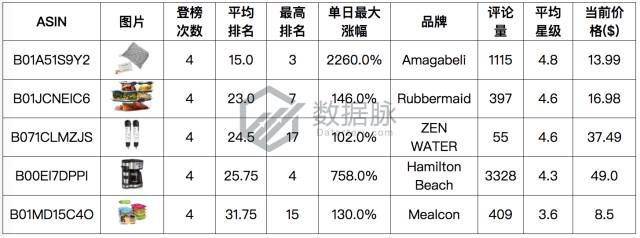 根据上周 Movers & Shakers 榜单上商品的登榜次数及平均排名,骆探长对登榜的商品进行了排序,其中排名靠前的五款商品如下所示: