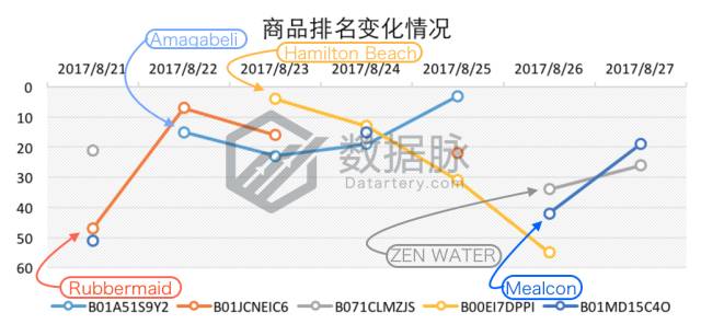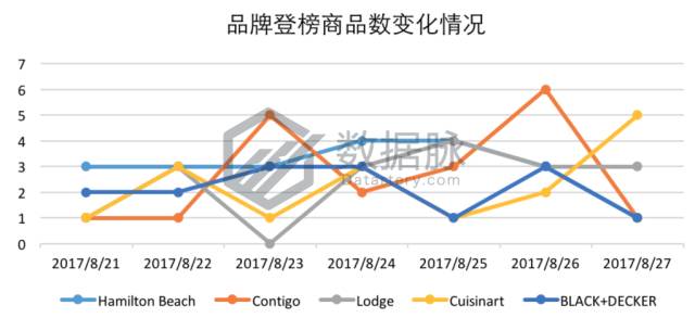 在上周Kitchen & Dining品类的Hot New Releases榜单中,骆探长(shujumai.com)发现,运动水杯品牌Simple Modern前期每日登榜商品数稳定增加,更在2017年8月24日登榜8款商品,共登榜34次,夺得品牌排名首位;尽管厨具品牌Aicok每日登榜商品数呈下降趋势,但 共有6款商品登榜,共登榜29次位列品牌排名第二;此外,品牌Omorc、品牌Upsante、品牌Utopia Kitchen分别登榜19、18、18次位列品牌排名第三、四、五位。