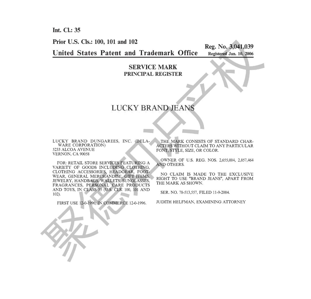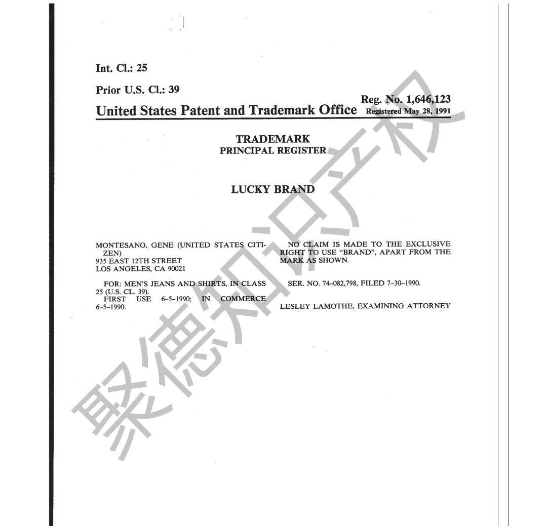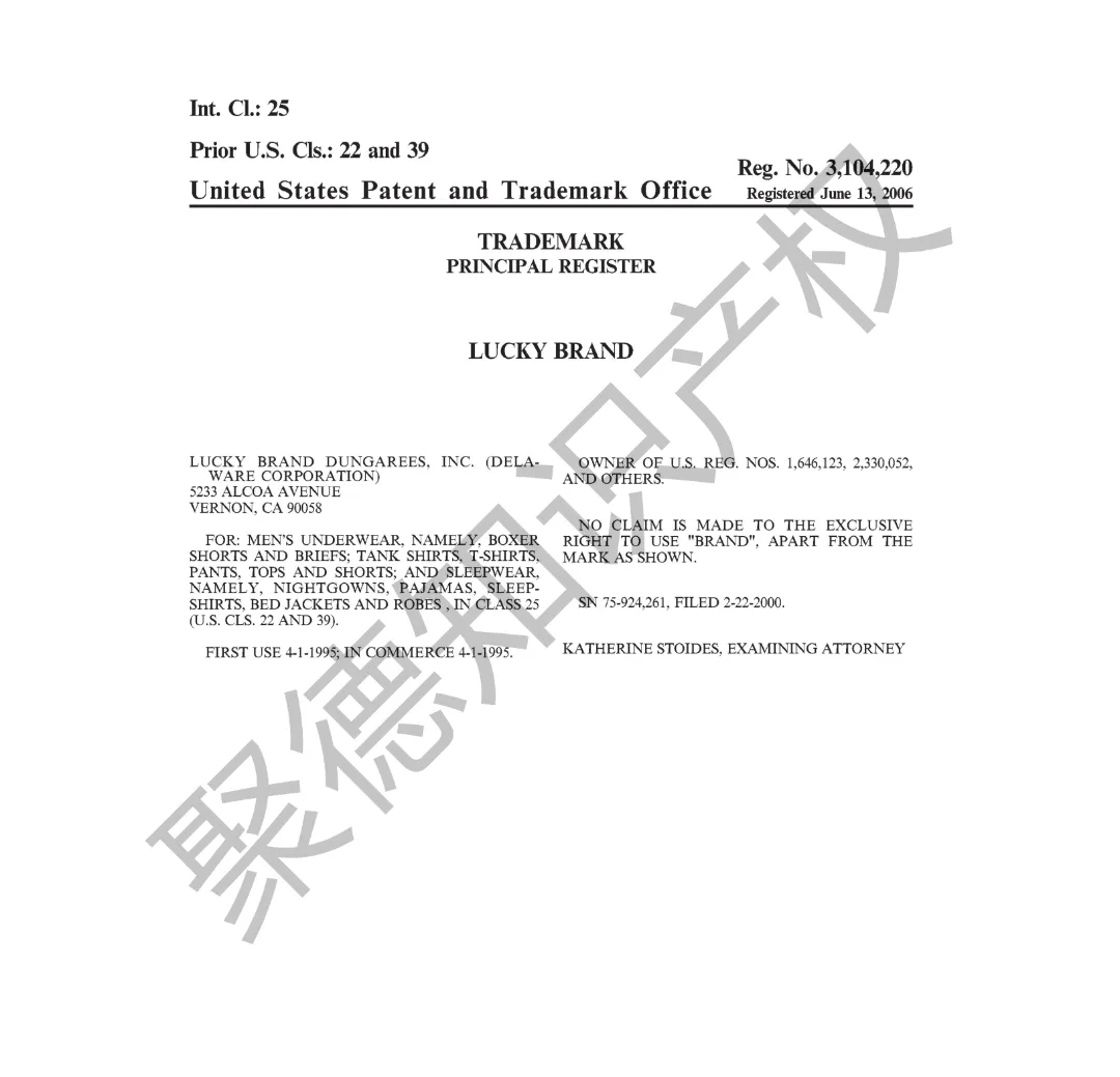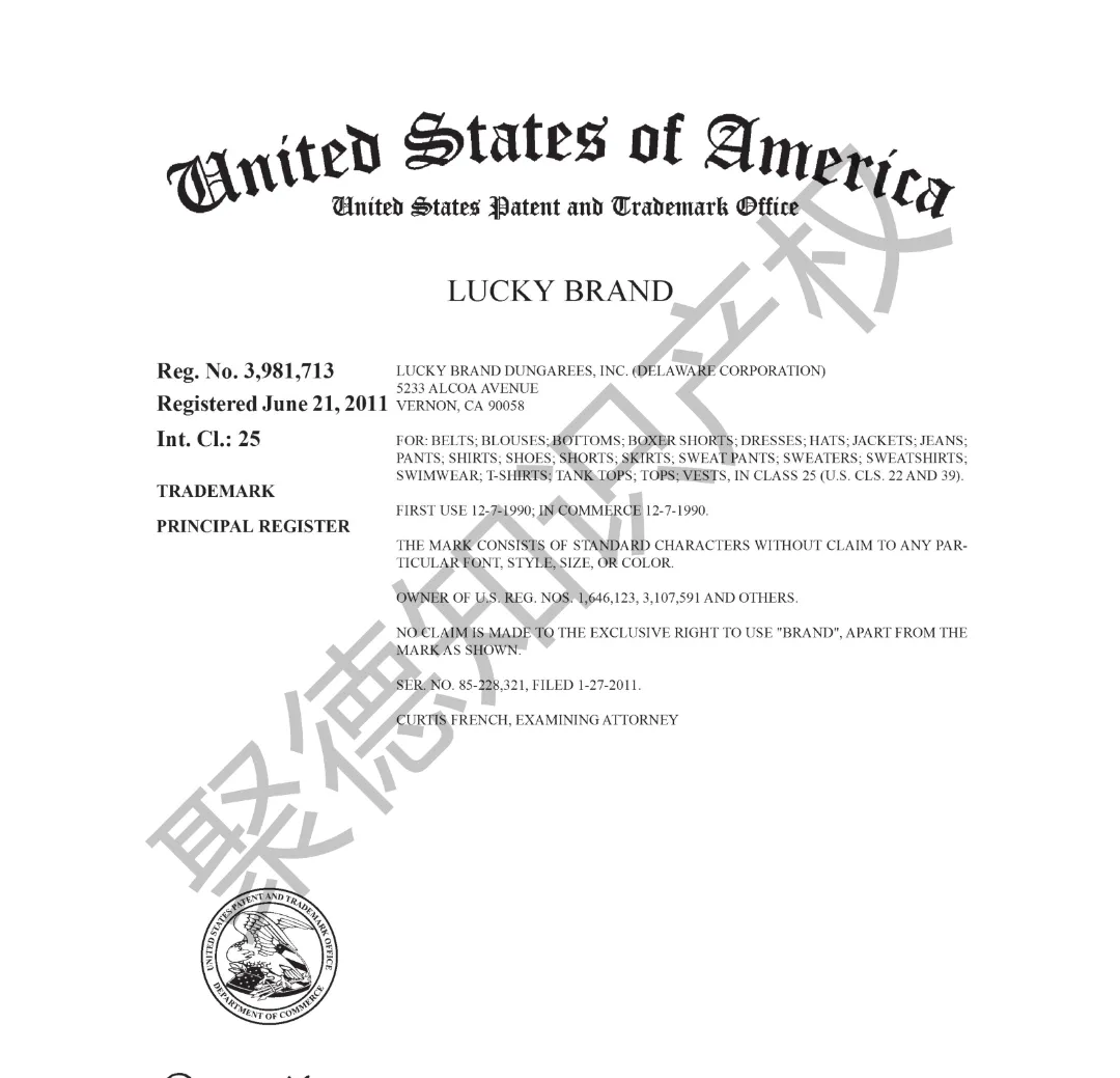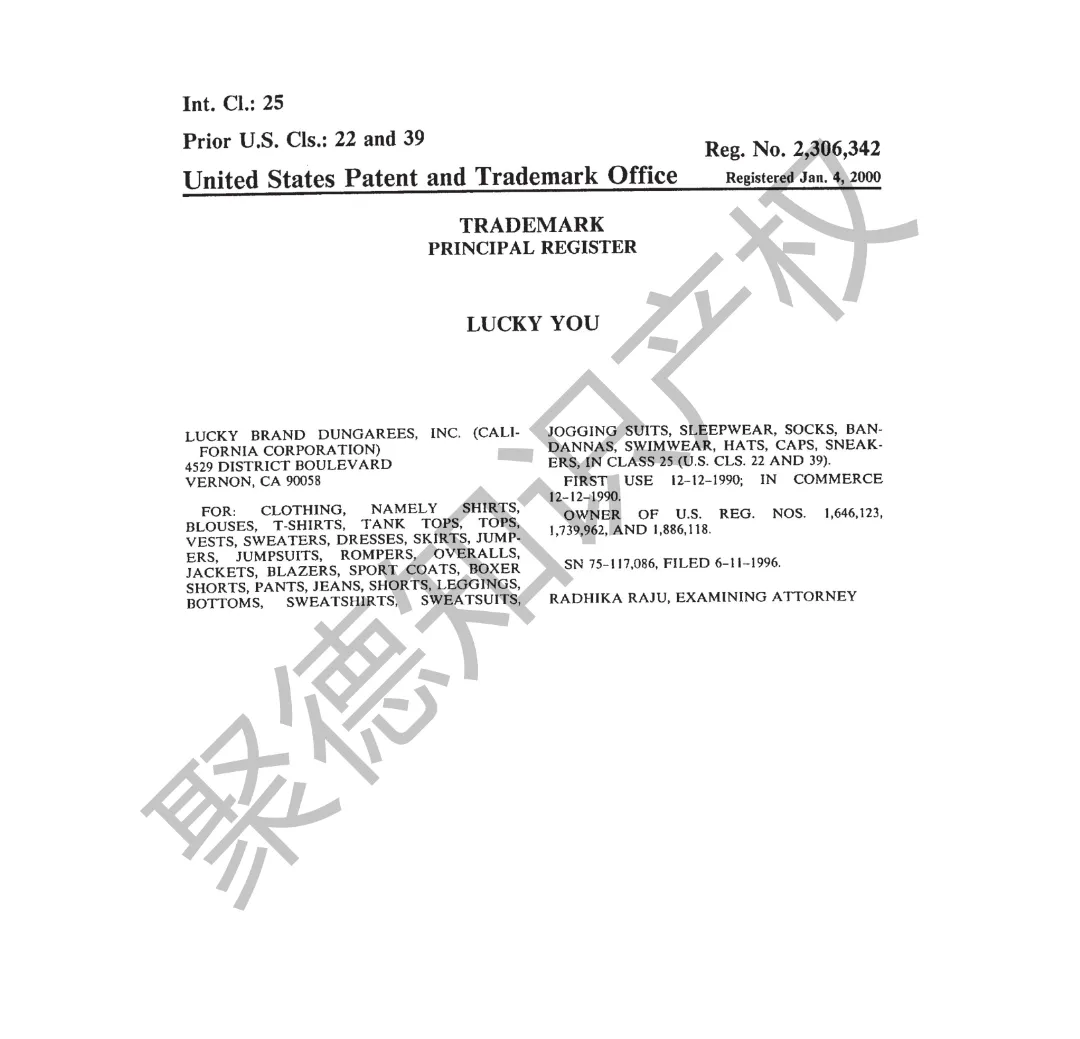原告旗下LUCKY BRAND品牌主营牛仔服饰,产品线同时涵盖运动装、外套、T恤及职业装等多个系列。其品牌商标已持续使用超过三十年,最早的注册记录可追溯至1990年,保护范围广泛覆盖牛仔裤、鞋履、内衣、泳装、珠宝腕表及眼镜等诸多品类。