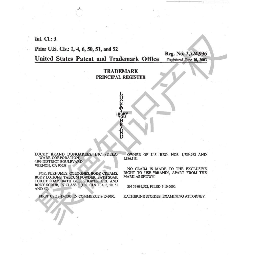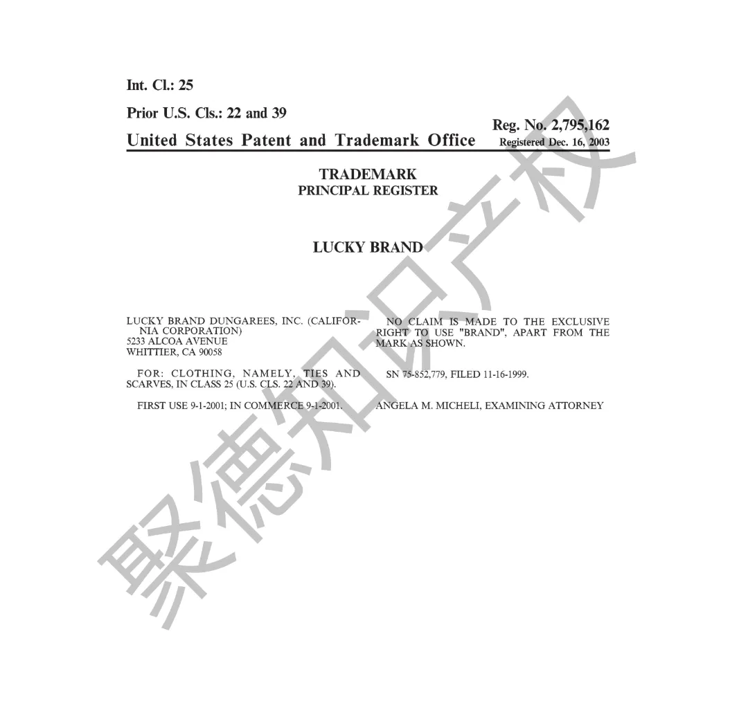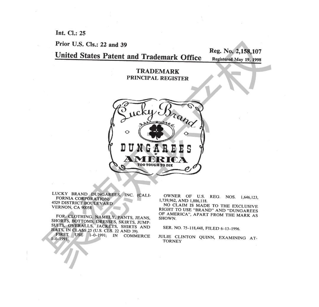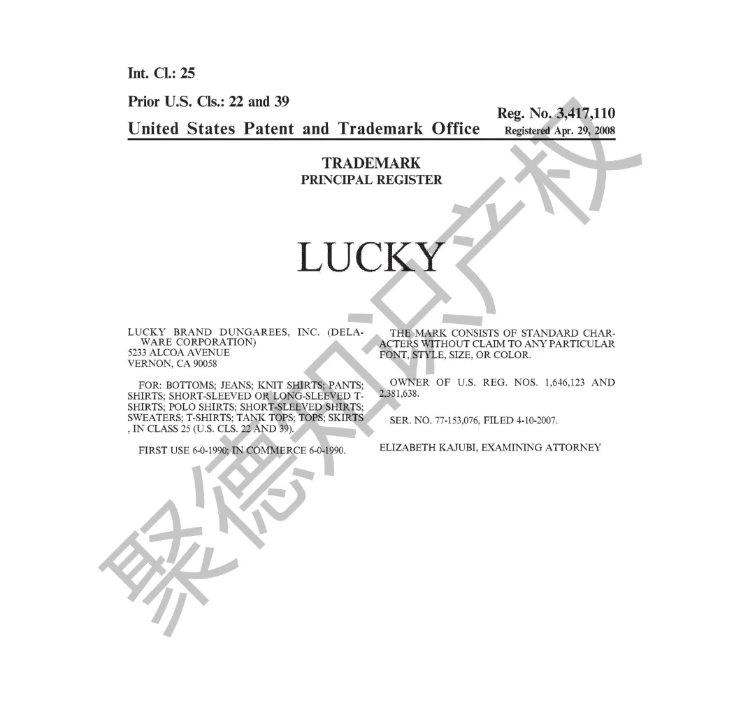 原告旗下LUCKY BRAND品牌主营牛仔服饰,产品线同时涵盖运动装、外套、T恤及职业装等多个系列。其品牌商标已持续使用超过三十年,最早的注册记录可追溯至1990年,保护范围广泛覆盖牛仔裤、鞋履、内衣、泳装、珠宝腕表及眼镜等诸多品类。
