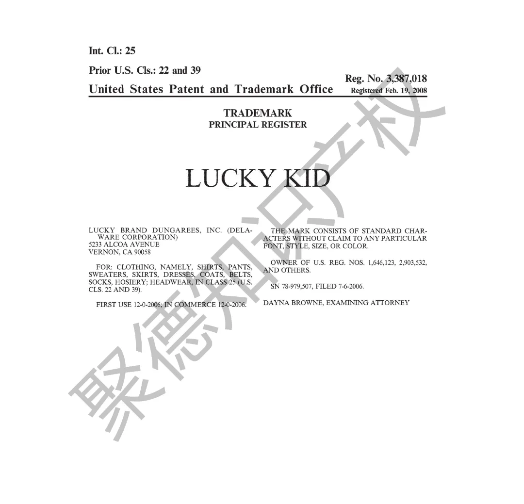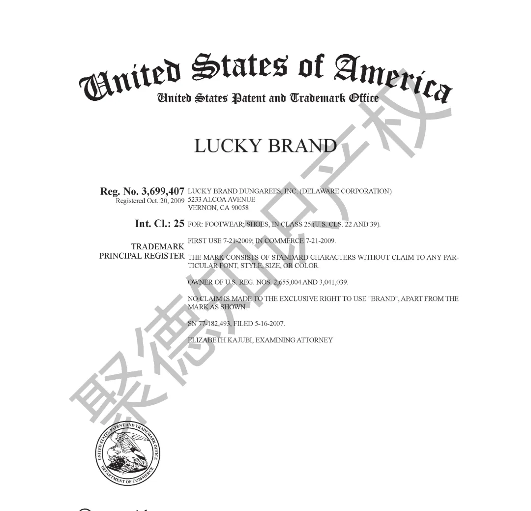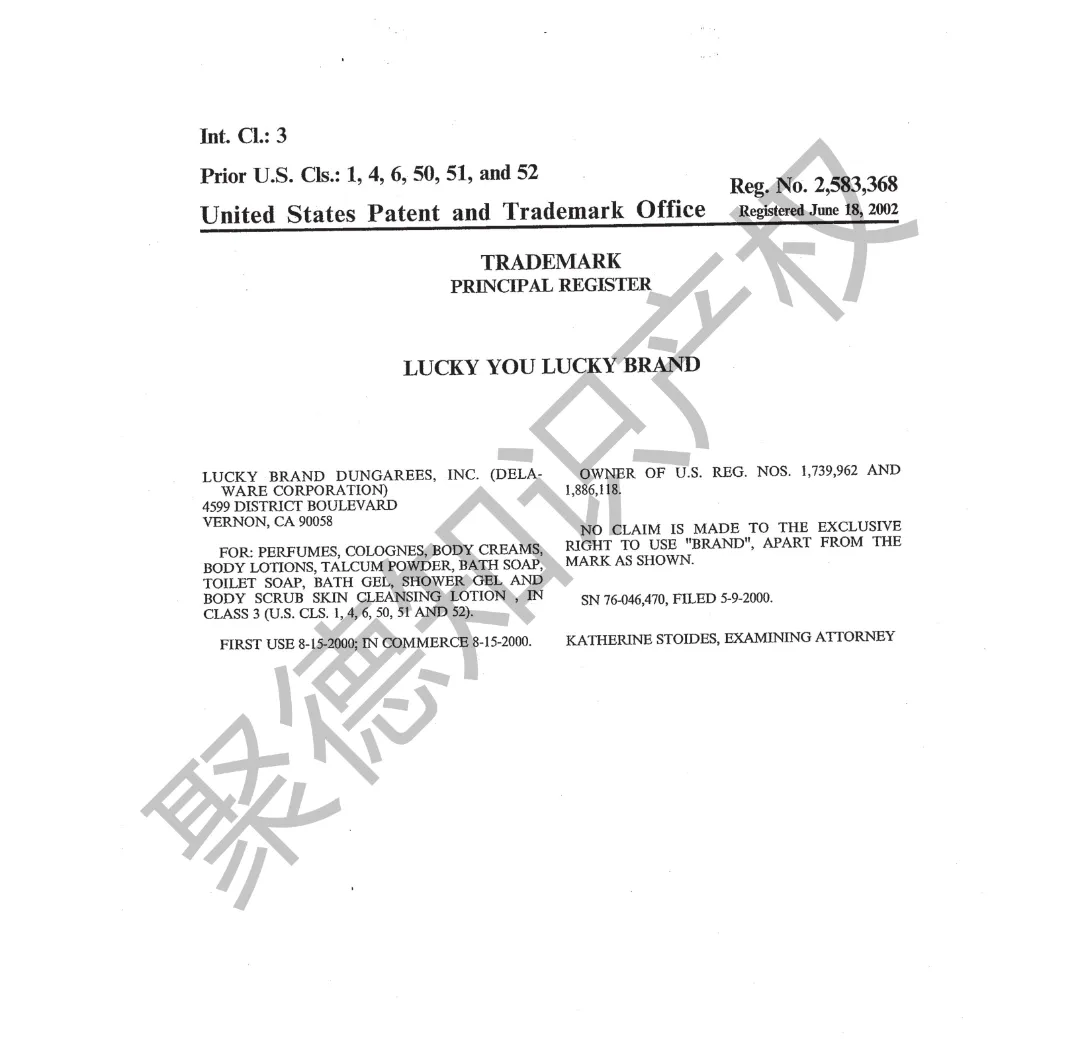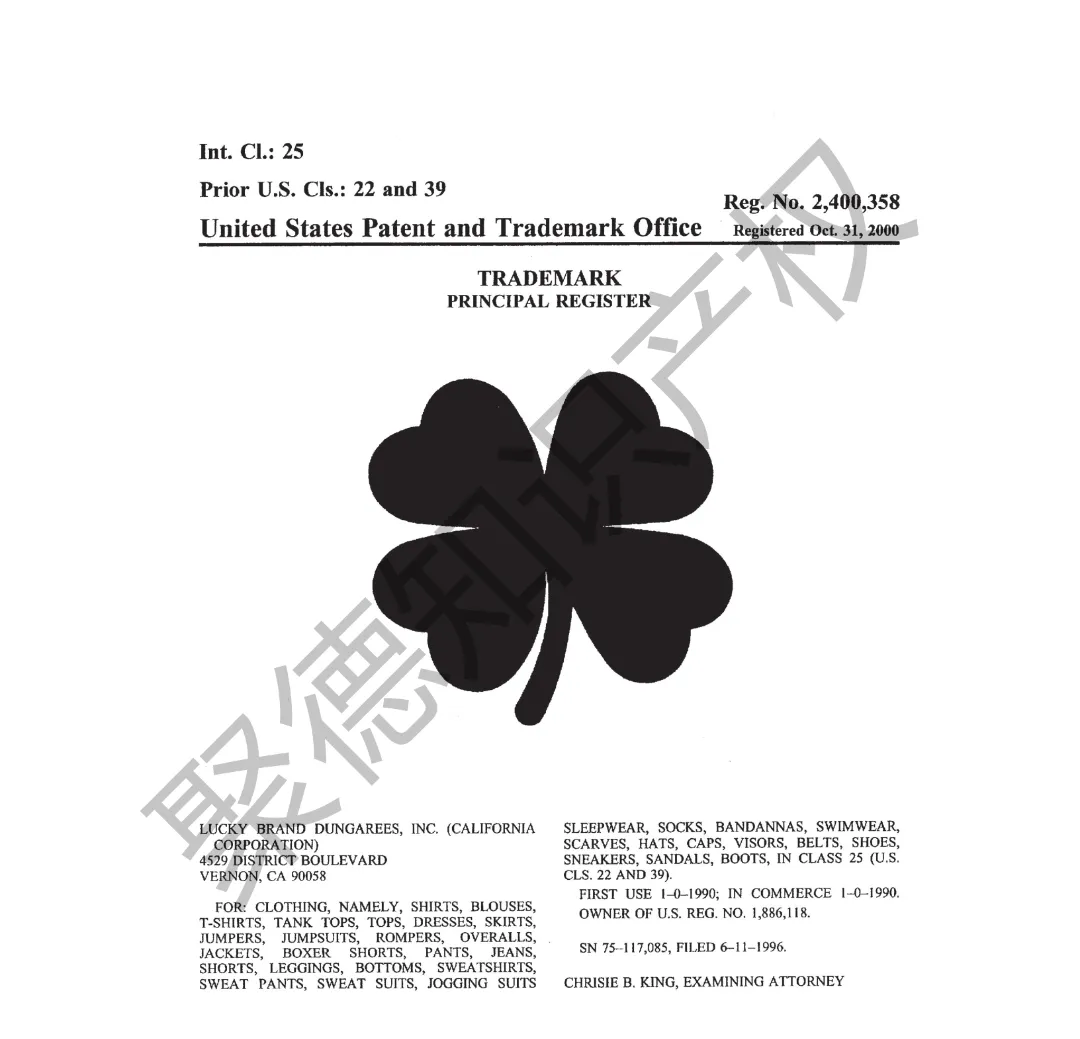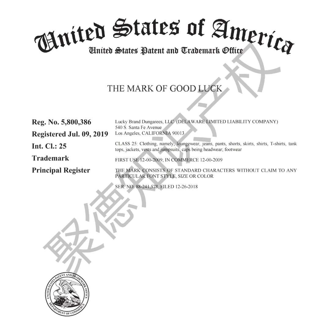 原告旗下LUCKY BRAND品牌主营牛仔服饰,产品线同时涵盖运动装、外套、T恤及职业装等多个系列。其品牌商标已持续使用超过三十年,最早的注册记录可追溯至1990年,保护范围广泛覆盖牛仔裤、鞋履、内衣、泳装、珠宝腕表及眼镜等诸多品类。
