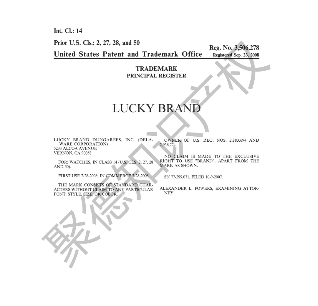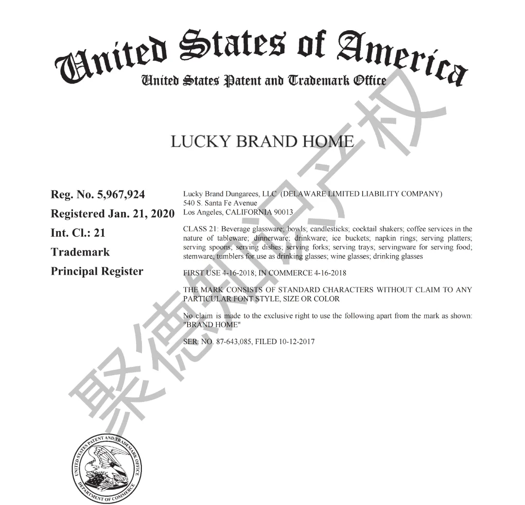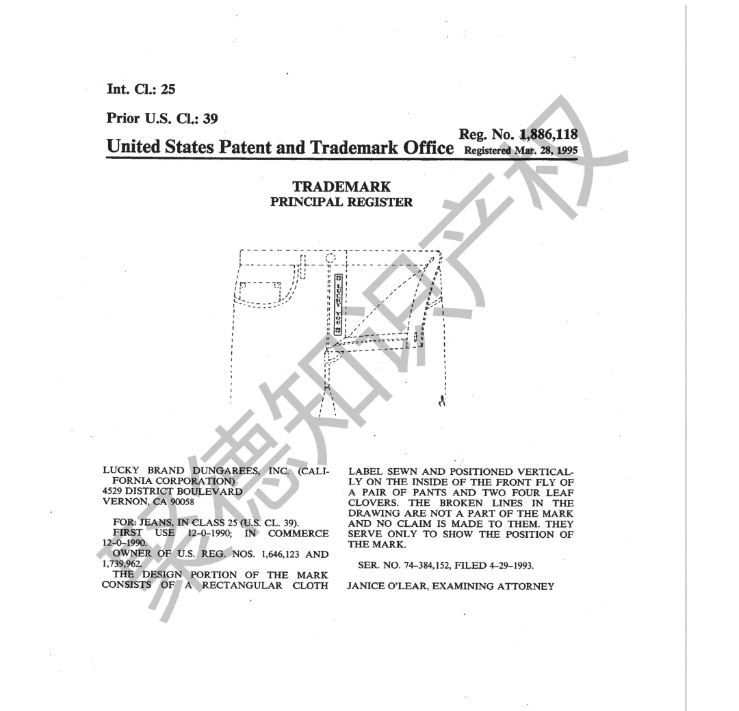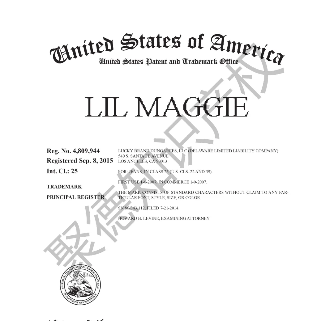 原告旗下LUCKY BRAND品牌主营牛仔服饰,产品线同时涵盖运动装、外套、T恤及职业装等多个系列。其品牌商标已持续使用超过三十年,最早的注册记录可追溯至1990年,保护范围广泛覆盖牛仔裤、鞋履、内衣、泳装、珠宝腕表及眼镜等诸多品类。