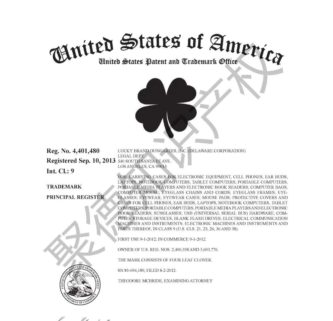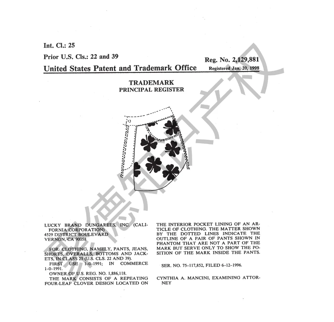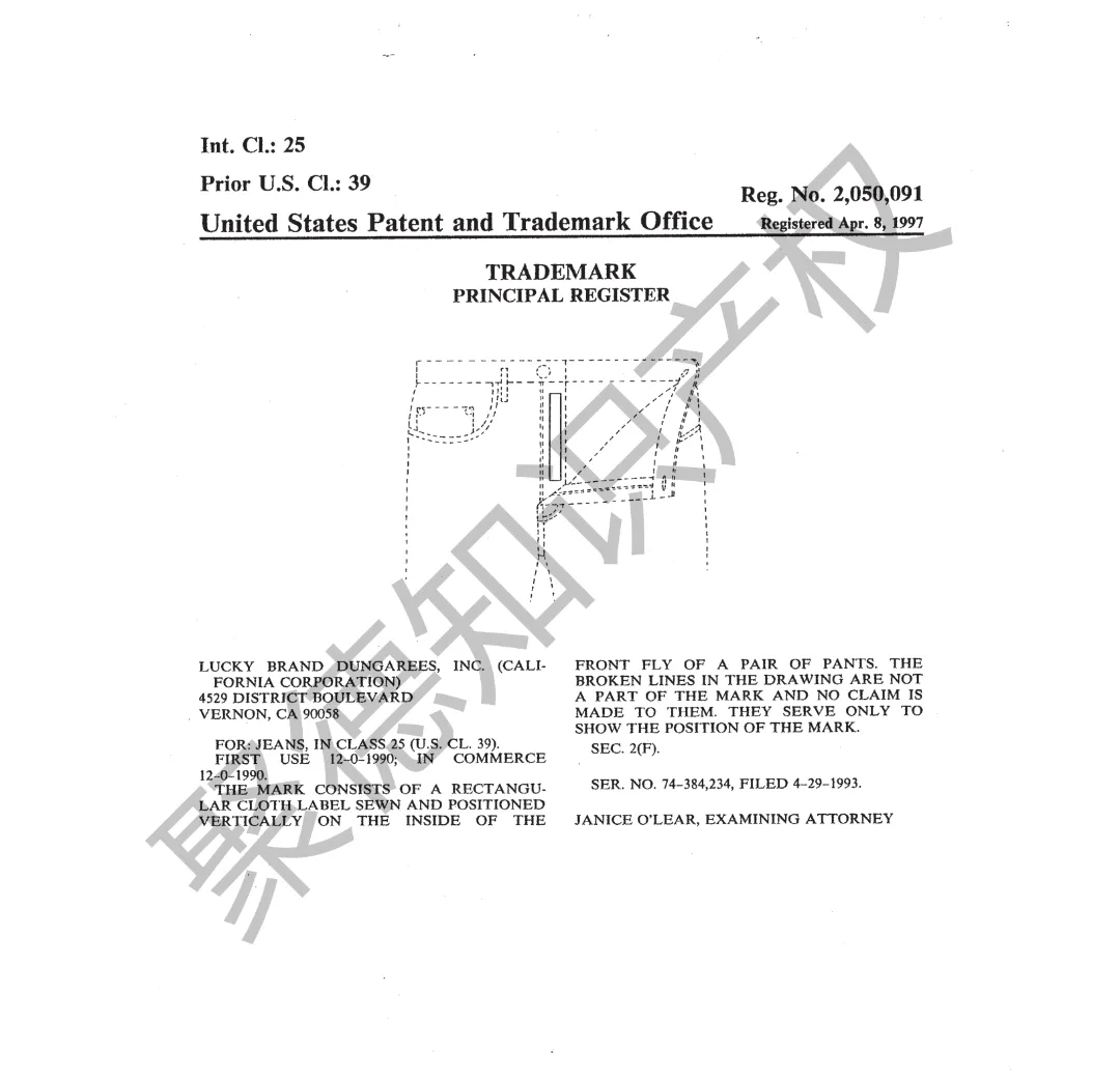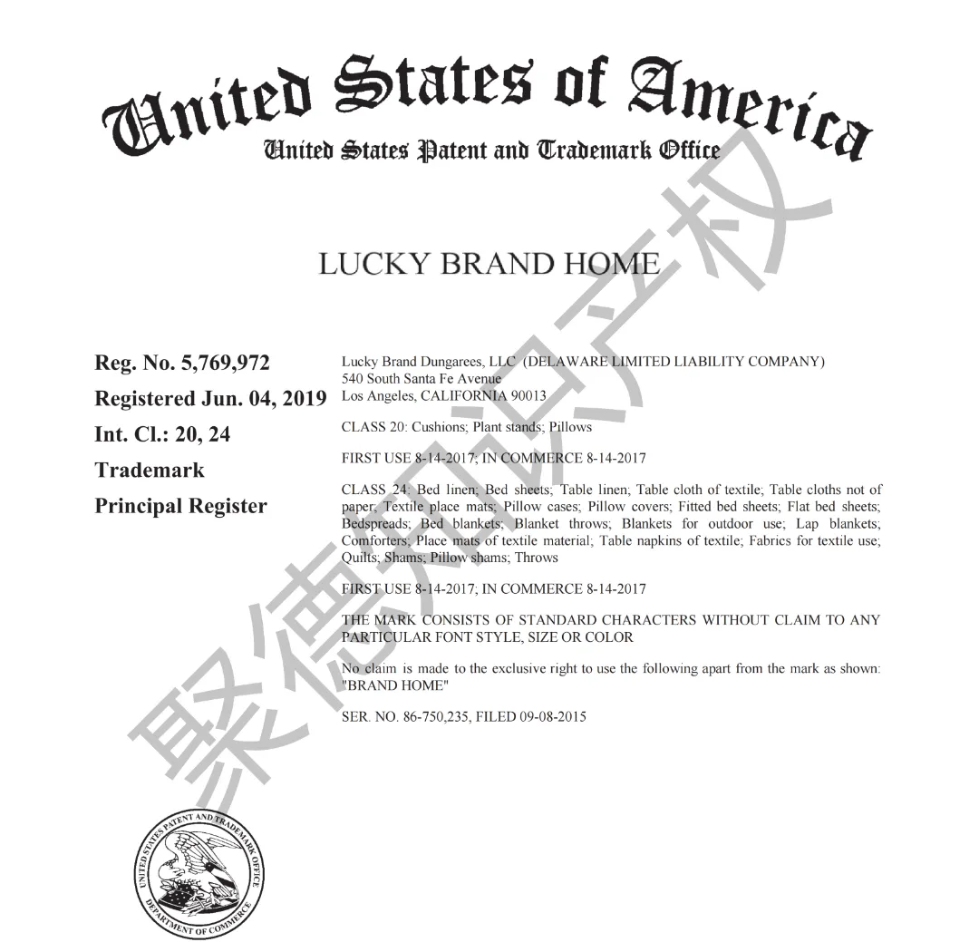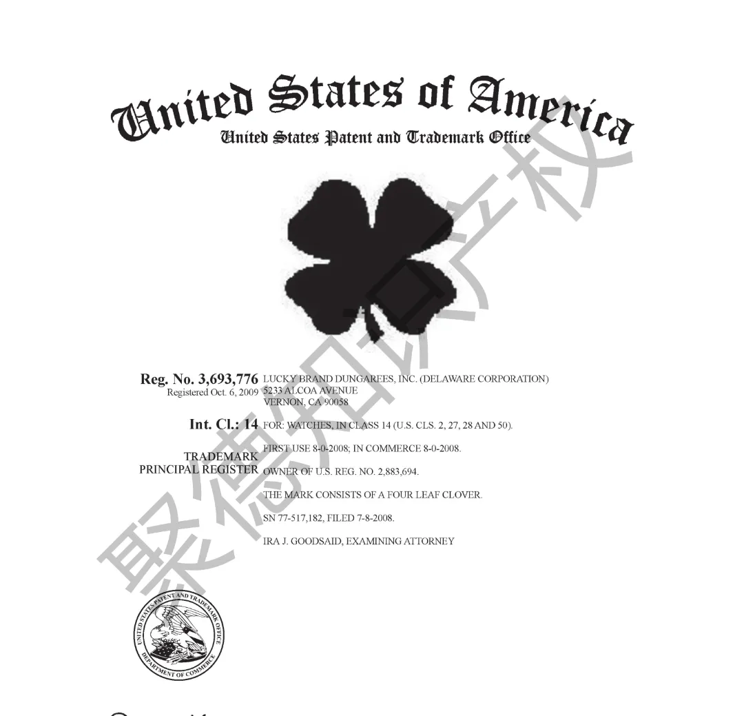 原告旗下LUCKY BRAND品牌主营牛仔服饰,产品线同时涵盖运动装、外套、T恤及职业装等多个系列。其品牌商标已持续使用超过三十年,最早的注册记录可追溯至1990年,保护范围广泛覆盖牛仔裤、鞋履、内衣、泳装、珠宝腕表及眼镜等诸多品类。