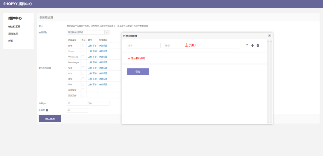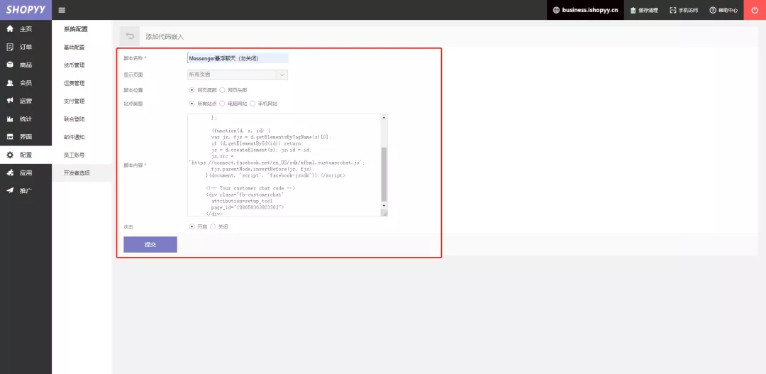 疫情期间,众志成城。在家办公,每天完善独立站一个小细节。 摘要 Messenger,作为Facebook旗下的在线聊天工具,大家都很熟悉,接下来具体讲一下如何给自己的独立站配置Messenger在线聊天工具。 目前来说,我所知道的有两种表现形式,一个是在自己独立站跳转到Facebook Messenger去进行聊天,另一种是悬浮在独立站直接点开直接聊。 Messenger在线聊天配置 悬浮聊天框配置 正常来说,咱们都有在Facebook开一个主页。 举栗子Derek有开一个主页ShopyyDemo(可以关注一下) PS:没有主页的,可以自己建一个,或者在Shopyy后台有官方对接应用,通过在Shopyy也可以建主页。 1、主页的功能简单说一下,类似自己的一个微博,可以免费开一个店铺!(所以勿信什么Facebook旗舰店,都是挂羊头卖狗肉卖独立站的) 2、右上角,点击设置。 3、在消息这一栏,分别有关于Messenger的通知设置,包括配置欢迎语,Messenger 网址,自动回复等等,而我们需要了解的是:把 Messenger 添加到你的网站。 官方的说法是: 通过顾客聊天插件,让顾客在你的网站发起对话,然后在 Messenger 中与你继续交流。这项工具安装简便,我们会提供所需代码,让你添加到网站上。 4、接下来点击开始配置。 首先,设置默认语言,以及欢迎语。 5、继续会配置一些颜色等等,最后,有个重点!记得左上方有个填写需要配置Messenger网站的网址!如图 右侧的代码复制下来,嵌入到网站即可! 举例:Derek一对一服务的Shopyy用户,后台点击配置-开发者选项-自定义代码,如图配置即可。 Messenger配置链接 跳转聊天 在上文中,设置里面有一个Messenger的地址,例如Derek的Messenger地址:m.me/108658363803303 官方说明: 你的 Messenger 网址 在 Facebook 站外展示 Messenger 链接,例如在传单、邮件或短信中。你的 Messenger 链接会让用户前往与主页的对话。 举个栗子: Shopyy的客户可以选择在应用商城搜侧边栏工具 值得一提的是,这里是要写主页的ID,不需要加前面的me这些前缀。 表现和悬浮的是有差异的,会有一个Messenger图标,点击跳转过去聊天。 心动不如行动,马上注册试用Shopyy独立站,让Derek一对一顾问式服务: 在线聊天的一些简要说明 对于大部分人来说,做的都是欧美市场,而这个市场的特性其实决定的还是以邮件为主,站内留言为辅。 甚至B2小B的小额批发,大部分是加WhatsApp长期沟通。 其他聊天工具的相关文章,Derek之前也曾提到了很多。 韩国市场 韩国市场独立站怎么配置kakao聊天? 日本市场 外贸独立站在线聊天工具Line的配置与使用 第三方tawkto 独立站在线聊天工具tawk.to安装配置教程 有很多第三方付费的聊天工具可以做多多种多样的功能,包括选择聊天对象客服等等。 独立站完善的权限系统 防止飞单 这个是多说的一点,因为Derek接触的客户比较多,建议卖家们重视关于飞单的情况,这些小事情要从建站最开始就去布局。 多的故事不讲了,太多,所以需要用到类似Shopyy的权限功能,除了网站,包括社交账户,笔记本,企业邮箱最好是公司配。 不同的角色员工,分配不同的角色权限。业务员只能看到相关的业务情况,产品编辑人员,只能看到相关的产品编辑模块。 1 财务:订单,付款权限 实现不同的角色权限有不同的管理模块开放。总管理员可以做角色控制。 防止业务员的飞单,除了加强管理之外,也需要从自身的企业做起来,把企业做大做强了,业务员也就没有那么多的小九九了,因为业务员会感觉复制成功的成本太高了,从一定程度上也可以避免这个情况。 并且运营的思路,需要运营中心和仓库分离的模式,很多跨境电商卖家,运营中心设置在沿海城市,仓库则设置在内陆城市,除了成本方面的考虑外,也可以避免一些员工眼红,毕竟看到的数据,和看到的整个整个货柜出货,那是不一样的感觉。
