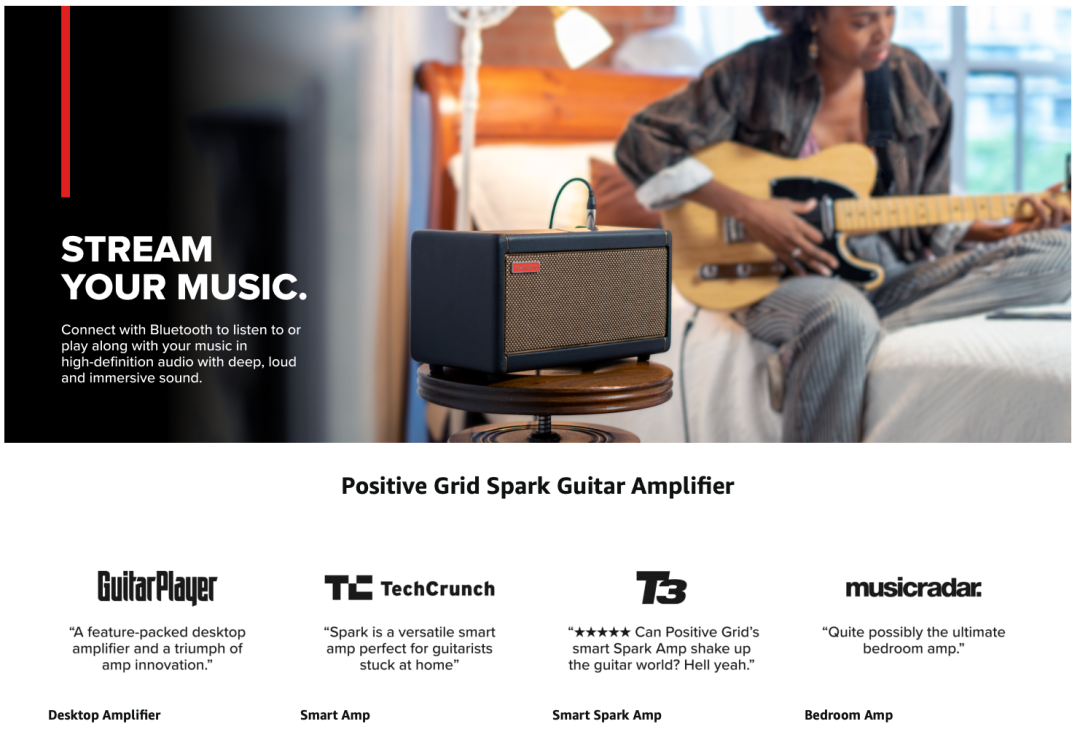 除此之外,Spark还在Guitar Player、TechCrunch、T3上进行测评,均获得非常高的评价,这些评价被它放到A+页面上。