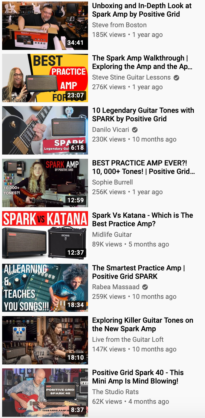 过去一段时间,Spark在吉他乐手中的呼声很高,在Youtube上,Spark有大量专业和自发的测评,播放量都不少。