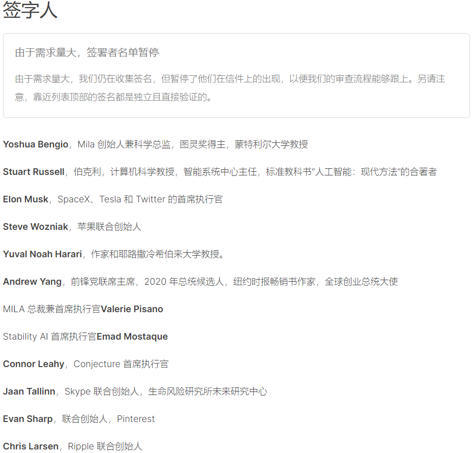 我们可以大概看到签名中包括各行业砖家巨头如:特斯拉马斯克、图灵奖得主、苹果联合创始人等。