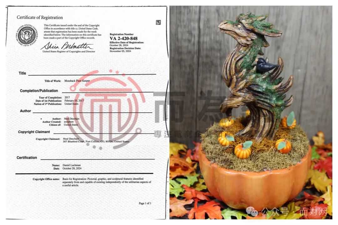 原告Neal Deschain是美国知名奇幻雕塑艺术家,以原创生物系列《The Arbori》著称。他的作品灵感源于自然界植物与动物的奇妙结合,创造出龙、狐狸、狼等充满想象力的生物形象,并赋予其雕塑与实用功能,如花园花盆和艺术摆件。自2001年起,他深耕雕塑领域,并著有《Fantasy Creatures in Clay》一书,分享其独特的创作技法与艺术理念。