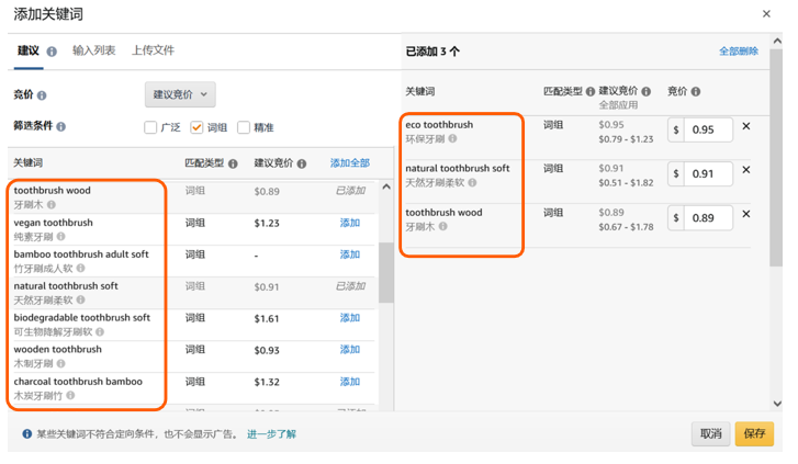 我们也可以通过建议的关键词排序依据找到合适的建议关键词,提升商品推广活动表现。
