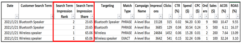 对于搜索词 “Bluetooth Speaker”,您可以看到商品推广在当天产生的展示量排名,您处于第2名,这意味着有1位广告主在当天对该搜索词获得了更多商品推广展示量。