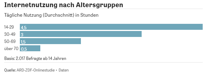 德国人口近8300万,超过90%的人使用互联网。有6330万人从14岁起就开始使用网络。日均网络使用时长为2.5小时。14-29岁用户每天耗在网络长达4.5小时,30-49岁用户也不闲着,每天3小时。