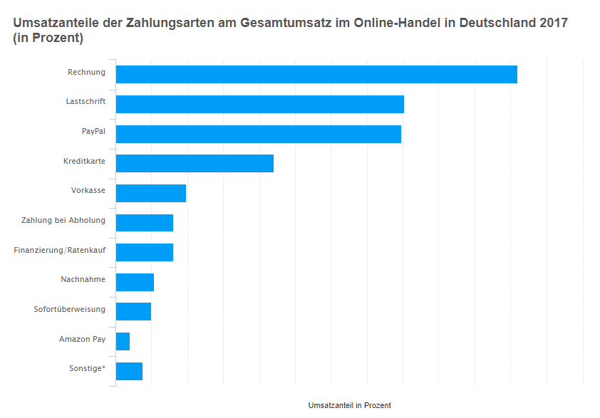 至于电子支付,德国人是强硬的顽固派。至2014年,还有二分之一的德国人网购使用账单形式支付,剩下39.9%的人爱用银行转账支付,9%使用Paypal。德国本土没有出现类似于支付宝这种在网店和实体店以及公共服务支付中广泛使用的电子支付渠道。至2017年,情况稍有好转,但Paypal的占有率仅仅约20%,大部分人还是倾向传统支付方式:账单、转账、信用卡、面付。