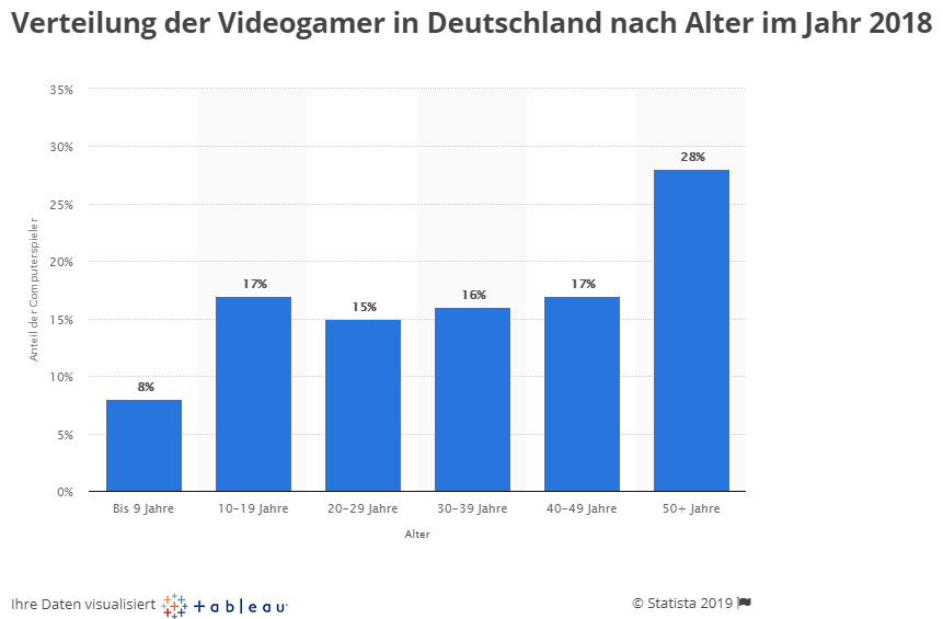德国游戏市场营业额近33.5亿欧元(2017年)。德国游戏玩家3400万,其中2800万每月玩游戏。28%的玩家年龄50岁以上,也是最大比例。48%玩家的玩家拥有大学及以上学历。