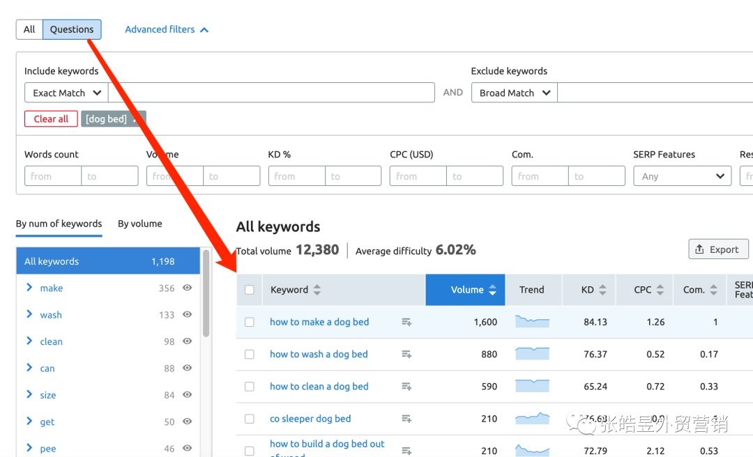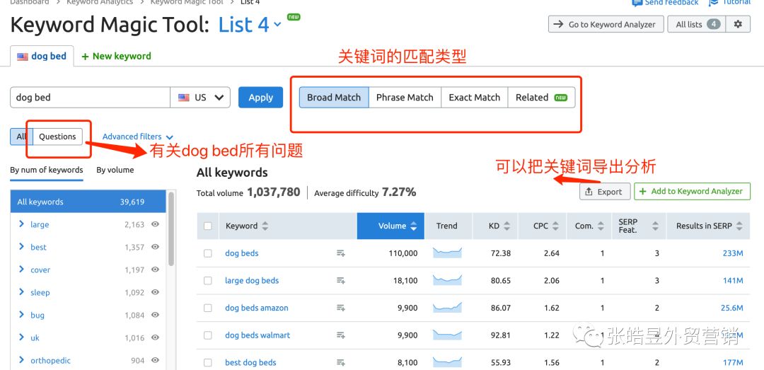 在左边我们看到有个by nums of keywords,这是啥意思,就是说dog bed所有的关键词里面跟主关键词搭配的其他词,有可能是描述大小,颜色的词,这种词出现的次数越多说明了越是用户关心的点。
