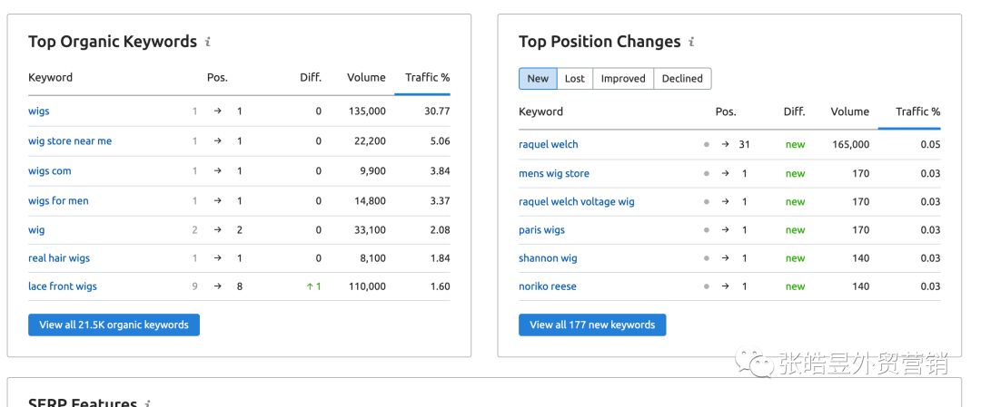 在organic research部分,看到有多少关键词带来了流量,排名靠前的关键词有哪些,关键词排名的变化,SERP FEATURE情况,带来流量最大的网页是那些,还能看到他的竞争对手有哪些。