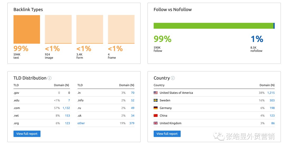 有多少个外链,有多少个外链域名,新增外链和丢失外链趋势,外链的类型(文字,图片,url),外链来源国家情况。