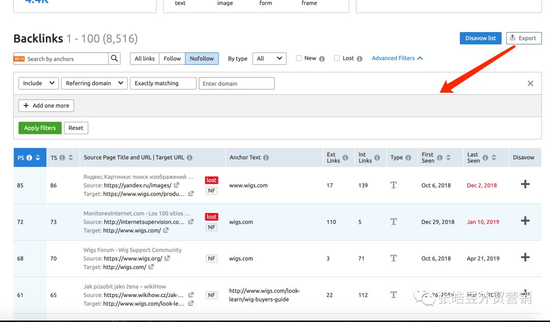 我们重点看下backlinks部分,在这一部分我们能够详细的看到竞争对手一共有多少外链,我们可以根据dofollow和nofollow筛选,我们要做的就是把这些外链导出到excel表格。然后点击外链链接进行分析,这个网站是否可以给我们也做外链,当然这个工作量比较大。