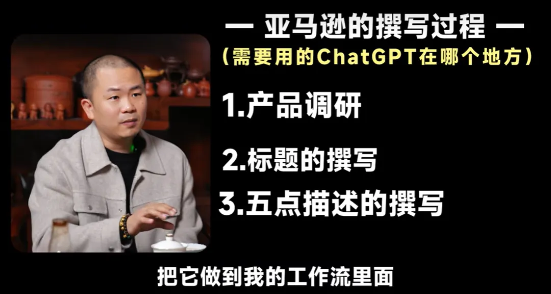 重构是什么?首先把标准流程梳理出来:亚马逊撰写过程中,哪些环节需要ChatGPT?产品调研、标题撰写、五点描述……把这些切到工作流里。以前人工12步,其中9步被RPA和AI替代,这就是重构。