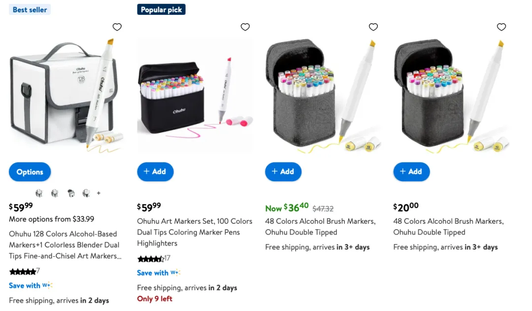 其中,Ohuhu品牌荣获 2021 年度浙江省跨境电商出口知名品牌,并多次进入 OneSight 编制的《BrandOS 出海品牌社媒影响力榜单》排名。 旗下马克笔产品深受绘画爱好者的热捧,被评为 2023 年度 EBRUN 全球好物,品牌销售额与销售量在亚马逊绘画笔类产品中排名前列。在沃尔玛,同样是Best seller榜单的常客。