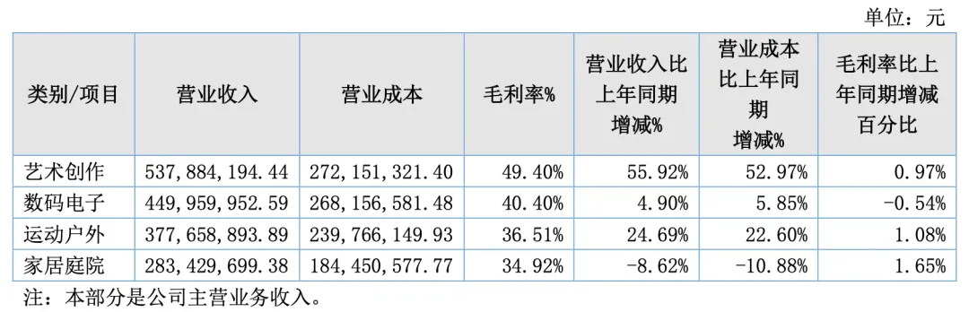 2024年,艺术创作、数码电子、运动户外及家居庭院是千岸科技最重要的四大产品线,收入都在2亿以上,总体相对比较均衡。