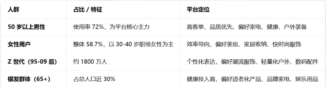 30 + 男性:主推高端家电、健康设备、户外装备,突出品质与品牌背书。 职场女性:主打低饱和度色系设计,嵌入 “时间管理” 场景故事,提升转化。 独居青年:强化 “一人份” 功能与空间节省价值(如 “折叠后体积缩小 70%”)。 银发群体:优化适老化设计,清晰标注安全功能,简化操作指引。 促销与物流策略