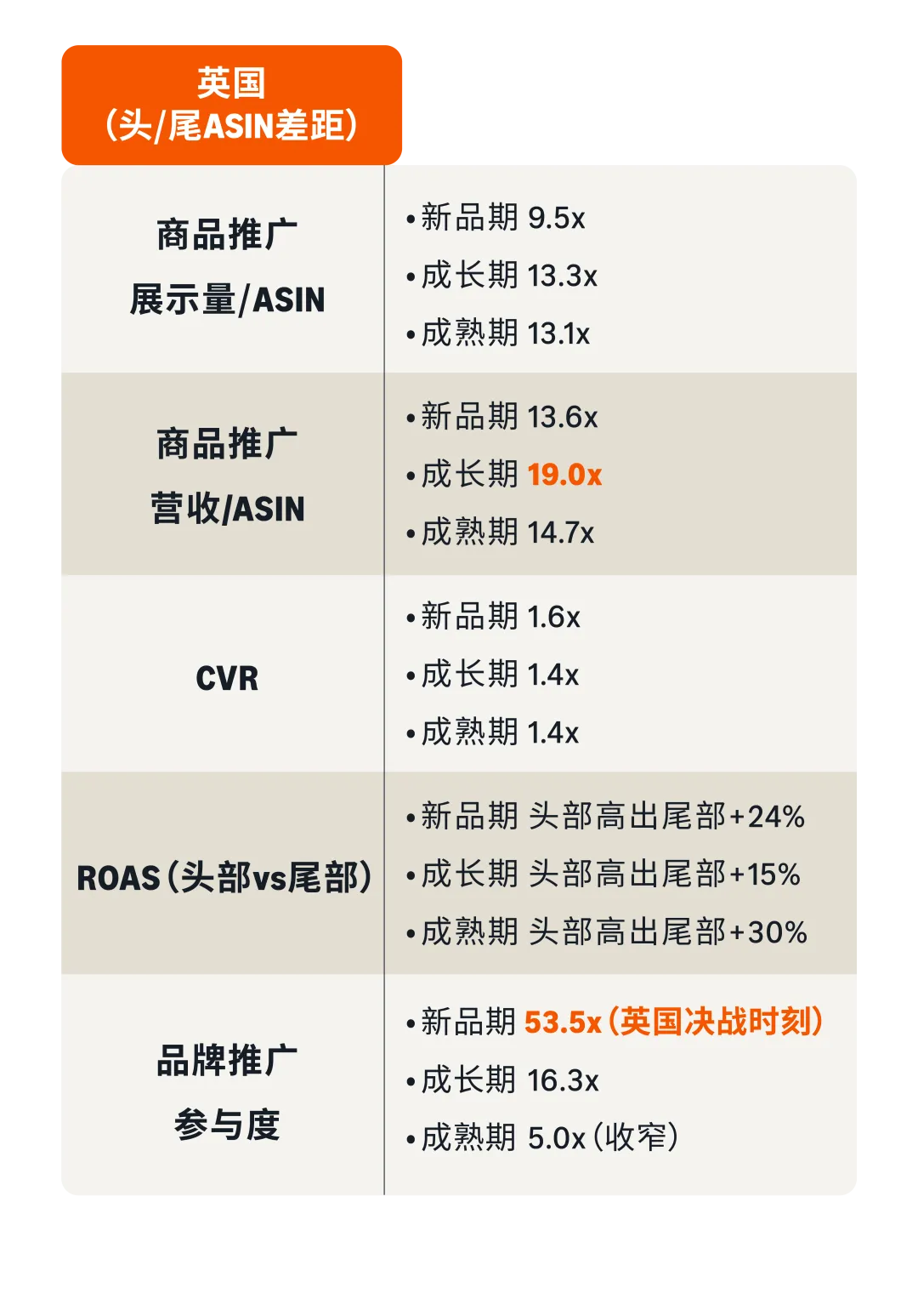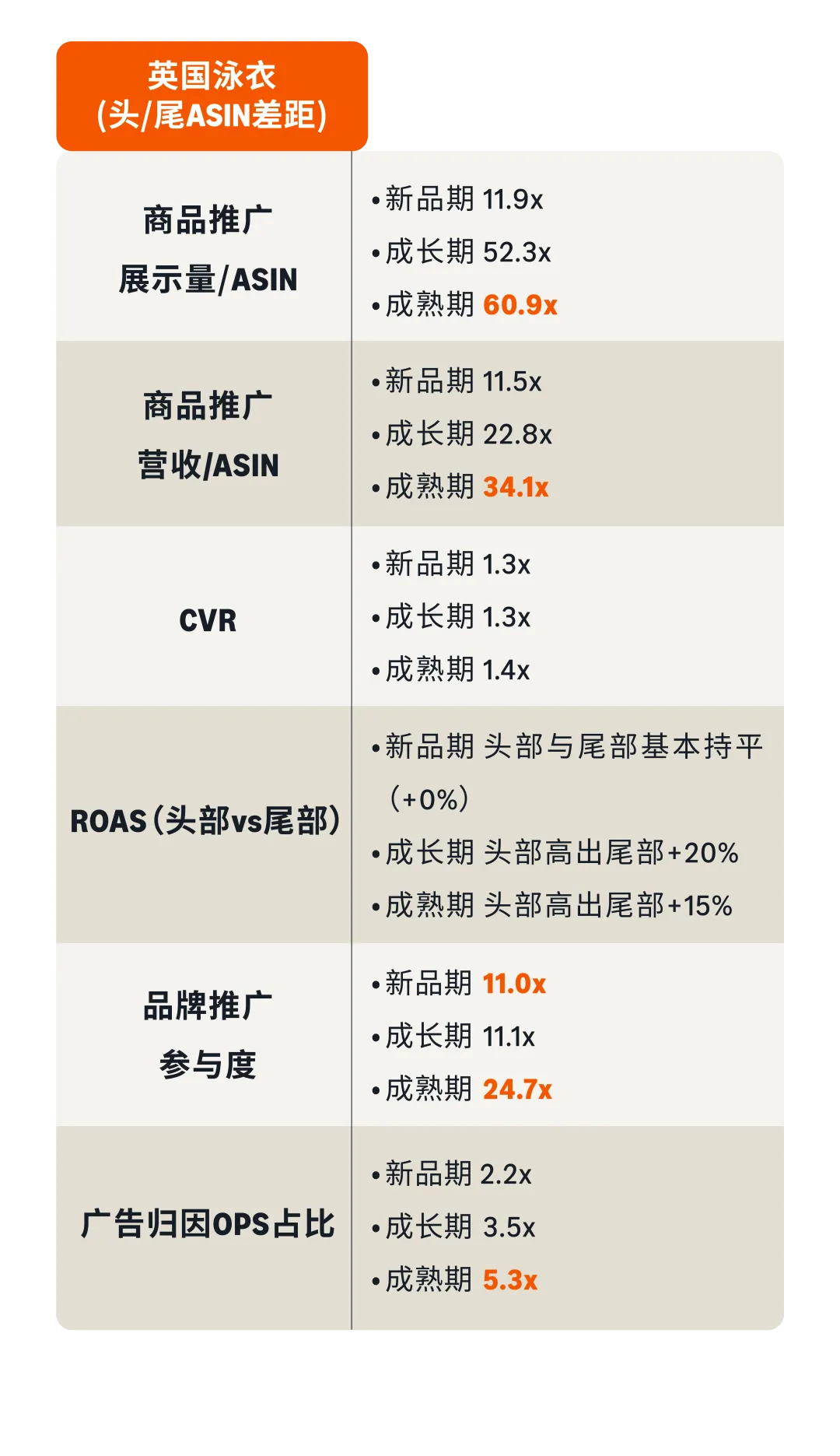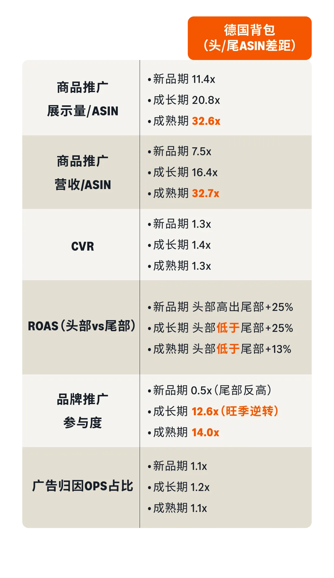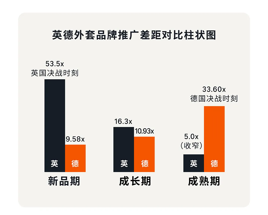 英国外套新品期SB差距53.5x,头部在旺季前用SBV打出品牌认知;德国外套成熟期SB差距33.6x(整个数据集最高),头部在旺季高峰全力加码SB。德国外套成熟期头部ROAS(4.06)低于尾部(4.44),但SP营收差距17.88倍——头部主动以成本换规模,ROAS是手段,营收差距才是结果。