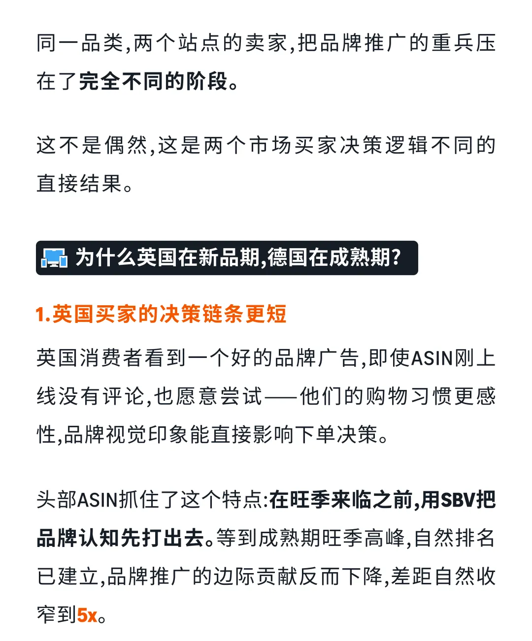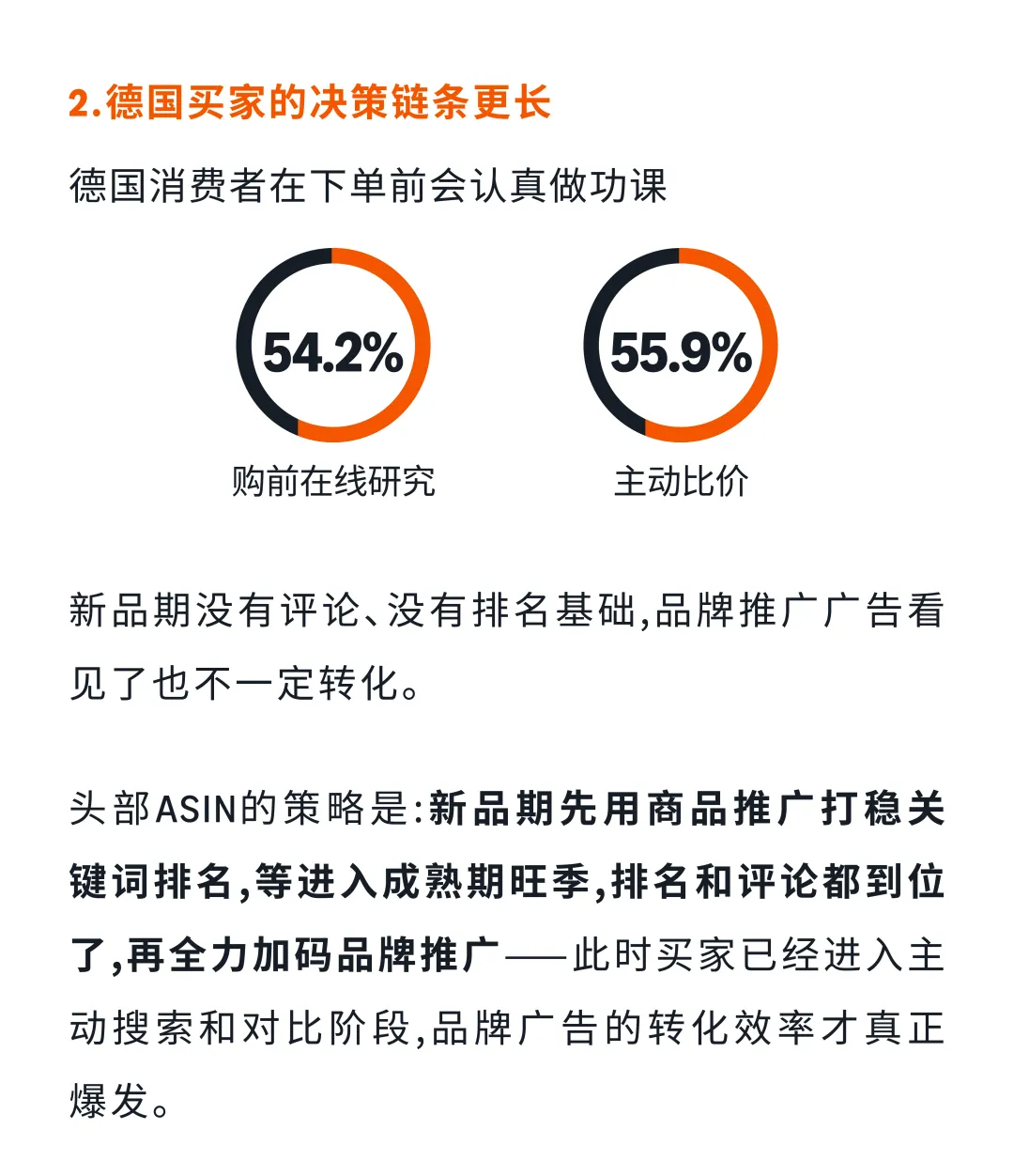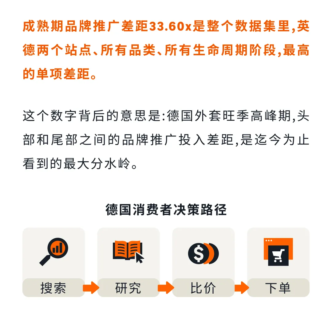 ASIN生命周期分为三个阶段:新品期(积累排名信号)、成长期(销量爬坡)、成熟期(守住份额收割需求)。英国买家决策链条更短,品牌视觉印象能直接影响下单;德国买家决策链条更长,54.2%购前在线研究,55.9%主动比价。