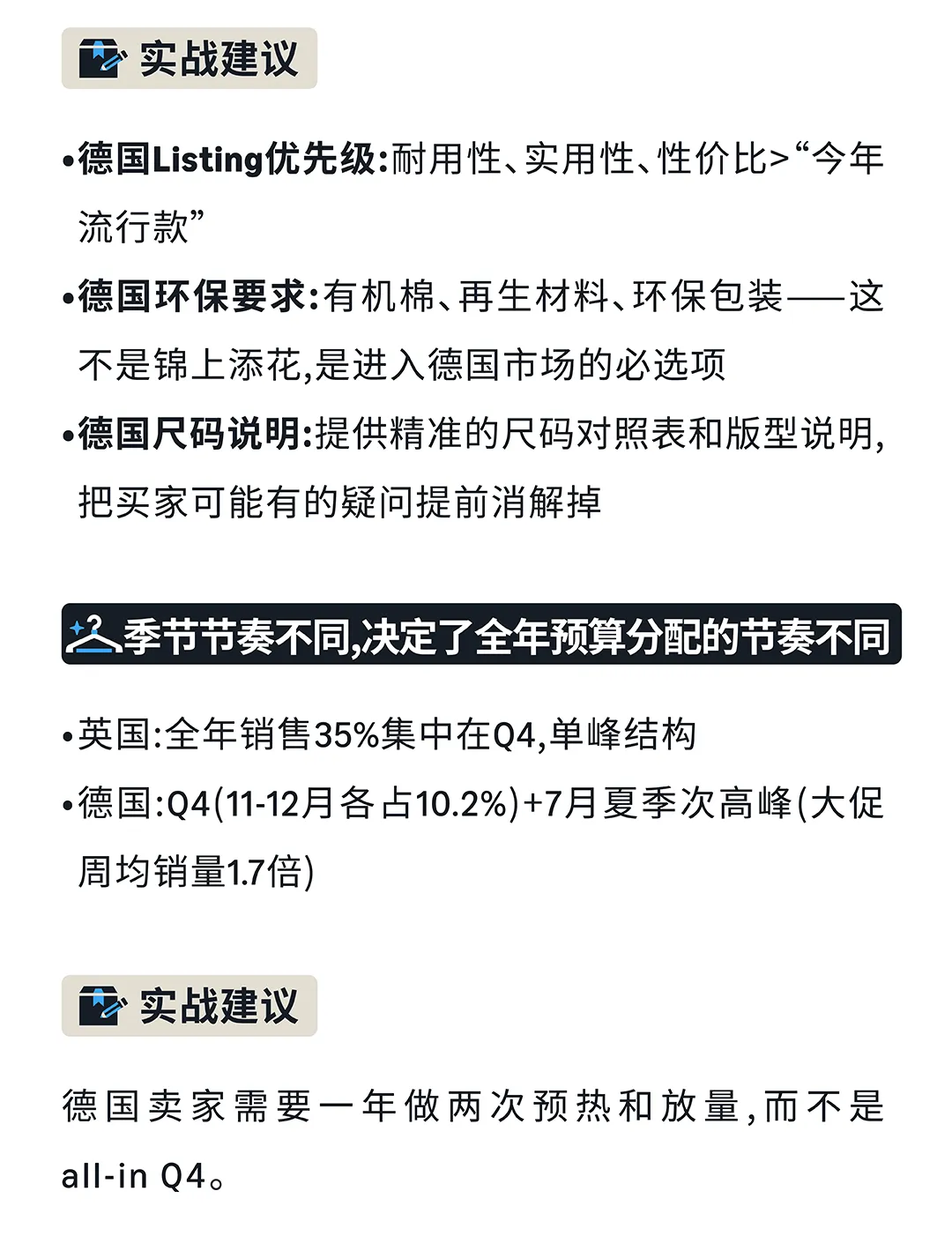 买家画像不同决定Listing优先级:德国主力45-54岁,75.7%看重可靠,51.2%期待环保;英国18-54岁均匀分布,更看重时尚。季节节奏不同决定预算分配:英国Q4单峰,德国Q4+7月双峰。
