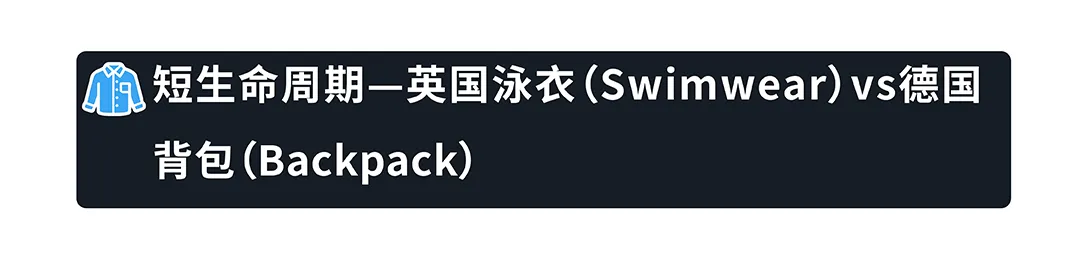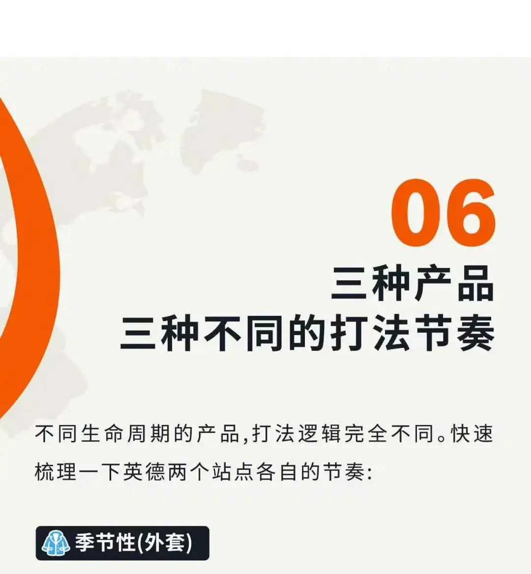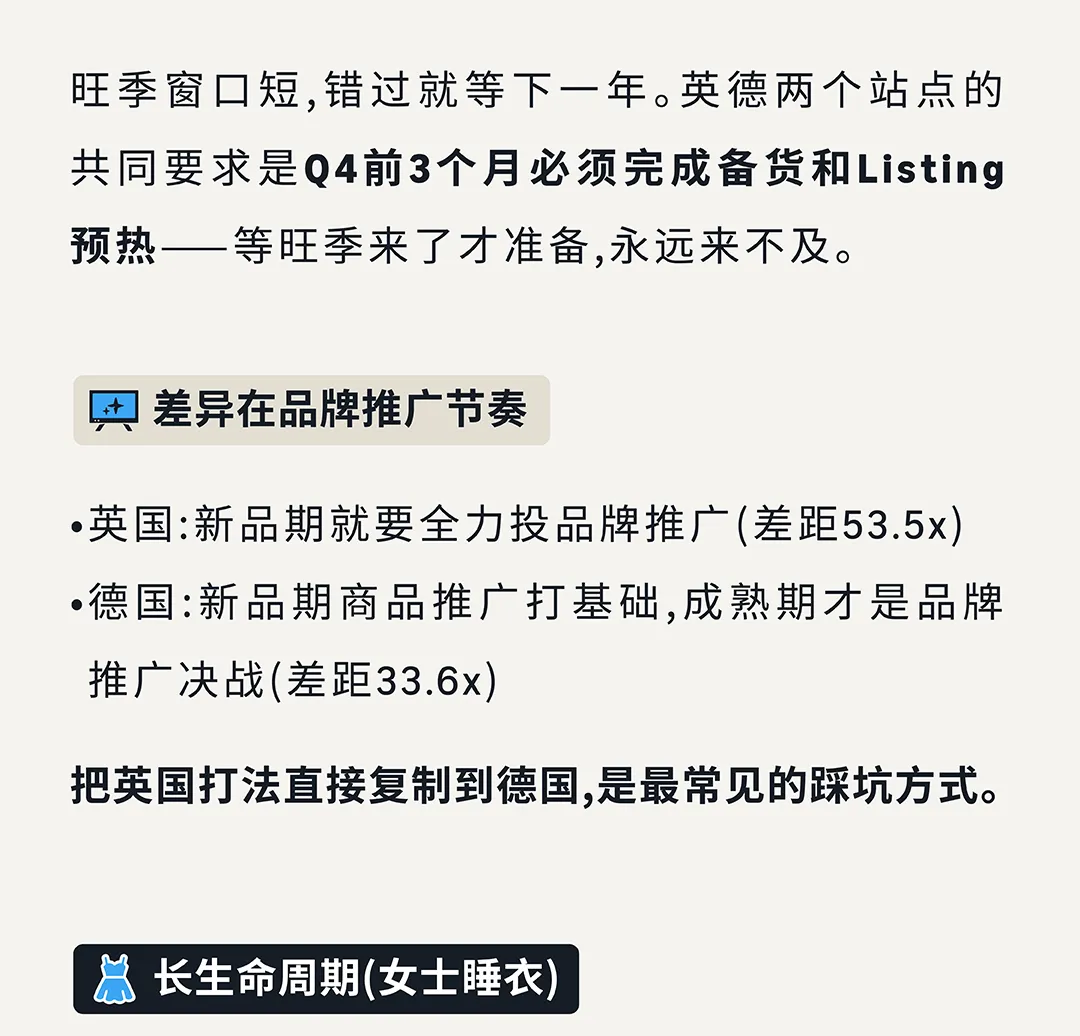 三种生命周期产品打法:季节性(外套)Q4前3个月备货预热;长生命周期(睡衣)全年在线靠评论复购;短生命周期(背包/泳衣)一年两次备货集中投入。