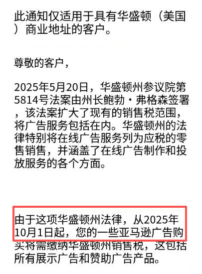 最近亚马逊卖家圈又传了个挺让人在意的消息——从2025年10月1日起,注册在美国华盛顿州的企业账号,在亚马逊上打广告要开始交税了。