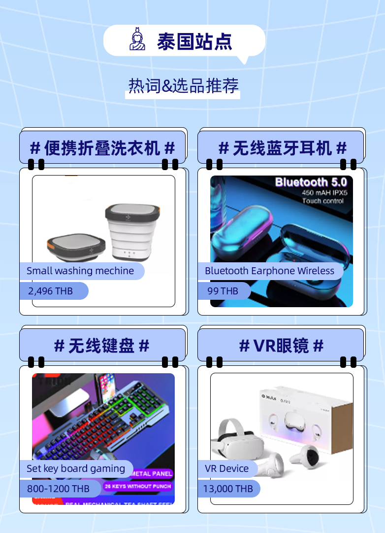 无线蓝牙耳机作为跨境优势类目,在出行热潮下更被放大。同样受益的还有智能手表等免提设备。关注创新家电商品消费,泰国消费者对于新兴的家电商品始终保持较高购买欲望,诸如手持吸尘器、涮烤一体锅、折叠洗衣机等国内家电高质量家电让泰国消费者有了新的居家生活体验。此外还有VR眼镜在元宇宙以及沉浸式娱乐体验的双重推进下,今年也有不错的销售增速。