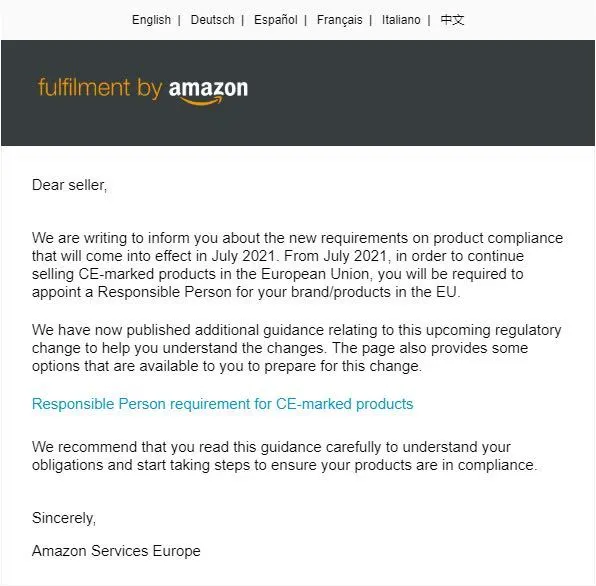 自从欧盟法规2019/1020发布之后,欧盟境外的制造商必须要求有欧洲代表,授权代表必须位于欧洲经济区境内并且具有商业注册地址。欧盟成员国的主管机关可以随时找上欧盟授权代表核查境外的制造商是否履行了欧盟相关的指令和法律所要求的职责。 在今年6月份亚马逊就给各卖家发邮件通知所有带CE标志的产品都必须要求有指定的欧盟代表, 要求卖家在2021/7/16日前确保CE标识商品必须有指定的欧盟授权代表。 法规要求所有获得CE认证的产品,包装上要求标示CE标记的同时也必须要打上欧代的公司名称和地址。CE代表产品通过安全符合性认证。欧代的目的是可追溯性的。客户、海关或者欧盟政府有什么问题的话,可以直接联系欧代这边,欧代可以沟通处理,起到一个沟通作用,确保可追溯性。 ! 亚马逊对违规卖家可能采取的措施 01. 经发现销售此类商品的卖家将直接移除商品 02. 账号会采取额外的强制措施 欧洲代表的职责 欧洲机构沟通桥梁 欧盟授权代表专门代表欧盟境外的制造商与欧洲EEA 30国的政府和机构打交道,提供制造商履行了欧盟相关的指令和和法律所要求的证据 合规信息确认 从欧盟境外进口的加贴CE标志的产品的包装、标签和使用说明书等上面必须清楚地印上制造商的欧盟授权代表(欧盟授权代理)的名称、地址。 “技术文件”必须保存于欧盟授权代理处 事故防范协助 欧盟境外的制造商必须在欧盟境内建立一套有效的“事故防范监督系统”,通过其欧盟授权代表/欧盟授权代理对产品的事故报告、通告、召回等等提供协助