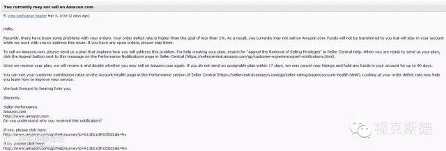 这封邮件的内容是不是很眼熟呢?俗话说得好“常在河边走,哪有不湿鞋”,不管是新手卖家还是老卖家,在经营的过程中总会遇到大大小小的审核,有些审核属于常规审核,可以不予理会,但对于“移除销售权限”这样的审核,那可是关乎我们店铺的生死存亡问题,是我们遇到的最严重的一类审核,今天福克斯德小编Lucy就为大家分析分析,遇到这类问题我们应该怎么做: 首先,销售权限被移除通常是由于以下几个原因造成的: 3.违反了亚马逊有关受限商品的规定,一些限制类的产品很多中国卖家是没有销售权限的,如果违反相关规定也会被移除销售权限。 不管是由于什么原因导致帐号权限被移除,亚马逊都会给一定的时间让你进行申诉(除了一些极特殊的情况外),而第一封申诉的好坏决定着是否能申诉成功,所以第一封邮件一定要好好写。下面我们要了解,一旦收到亚马逊移除销售权限的邮件通知,我们写申诉格式是怎么样的?具体思路如下: 第 4 步:提交申诉信。 1.登录你的卖家账户; 2.单击“绩效”链接上的绩效通知; 3.找到你收到的有关取消销售权限的 通知,单击申诉按钮; 4.单击对决定提出申诉按钮; 5.在提供的表格中输入你的行动计划 详情; 6.单击提交申诉以向卖家绩效发送已 填写完毕的申诉。 第 5 步:关注你的电子邮箱是否有亚马逊的回复,一般亚马逊会在48小时内回复对你的审核决定。 以上就是怎么完成一封申诉的流程,下面给大家举几个例子,告诉大家遇到以下原因导致销售权限被移除时,我们该怎么写行动计划。(任何情况下,你的申诉都应包含一份行动计划,并且该计划应该表明已经找到自己的销售和库存管理实践中存在的问题。说明你准备如何改变自己的销售策略以解决问题。) 例 1:邮件通知表明,你的销售权限因订单缺陷率较高而被移除。 行动:首先,确定哪些指标(负面反馈/亚马逊商城交易保障索赔和/信用卡拒付)未达到亚马逊的绩效指标。 评估时,需要阅读买家留下的所有反馈评论。 如果评论反映不能及时回复买家邮件,你可以在行动计划中说明安排每日回复所有买家信函的时间;如果是产品质量破损或者产品与描述不符,则要在行动计划中加入产品质量把控、物流服务优化等举措;如果是因为未收到产品,则要在行动计划中加入更换物流合作商以及发FBA的事宜。 例 2:邮件通知表明,你的销售权限因迟发率较高而被移除。 行动:去后台查一下设定的配送交货周期是否太短,货代方面是否有问题,你可以在行动计划中加入修改交货周期,与物流能力更稳定的货代合作、发FBA等解决问题的方案。 例 3:邮件通知表明,你的销售权限因配送前取消率较高而被移除。 行动:检查是否由于上架的商品长期缺货所致。 你可以在行动计划中列出每日监控库存,以确保自己绝对不会上架无法立即配送的商品。 例 4:邮件通知表明,你的销售权限因退款率过高而被移除。 行动:检查是由于什么原因导致退款,是产品质量问题、物流问题还是其他的原因,你可以在行动计划中加入产品质量把控、物流服务优化、售后服务改进等举措。 PS:一般分析原因时,你可以从这几个角度进行分析 1.设置配送交货周期:你设定的配送交货周期是否太短? 2.与买家沟通:你是否有效回复买家的问题,并以及时、礼貌的方式回复他们? 3.在库库存:你是否长期缺货并因此被取消订单? 4.商品信息:你是否在商品评论中准确描述商品? 5.运达时间:你的物流合作商物流能力是否能够在规定的时间交货? 6.售后服务:出现问题时,你是否积极与买家沟通解决问题? 第二种情况,因为违反政策导致销售权限被移除 例 1:邮件通知表明,你的销售权限因销售促销版媒介类商品(Amazon.com 禁止这种做法)而被移除。 (对于中国卖家来说这种情况比较少,但也可以看一下,避免以后自己出现这样的问题) 行动:检查自己的库存和库存补货流程。货件中是否包含了促销类 CD。,你可以在行动计划中列出:立即从库存中删除这些商品,然后做出更改以确保你定期检查库存并删除促销的媒介类商品。 例 2:邮件通知表明,你的销售权限因侵权被移除。 行动:查看自己是否已经侵权,如果已经侵权,你要在行动计划中表明,将立即删除店铺中所有的侵权产品,并且联系权益被损害的产权所有者解决问题。 以上例子并不能涵盖所有导致销售权限被移除的原因,但是思路是一样的,就是要找到问题所在,从根本上提出解决问题的方案,这才是亚马逊想看到的切实有效的行动计划。下面附上文章开头邮件截图——-这个案例的申诉思路 在收到平台的移除销售权限邮件后,我们立即采取了行动,详细的分析了导致我们店铺销售权限被移除的原因,主要有以下原因: 1.ODR指标超出平台指标要求,这个是导致我们销售权限被移除的根本原因。 对于导致我们销售权限被移除,我们已经有了明确的认识,在此基础上,我们制定了如下改进计划,来解决我们目前的店铺问题: 1.关于ODR指标过高问题,首先我们要做好产品质量的把控,将由于产品质量导致客户满意的可能降到最低;其次,我们要积极跟我们的物流商进行沟通,避免在运送过程中导致产品破损,同时在将来我们打算发FBA,以此来避免买家不能收到货的问题,并且改善买家的购物体验,降低买家服务不满意率;再者,一旦订单产生,就与买家保持积极的沟通,避免买家的问题得不到解决,并且一旦发生买家发起A-Z