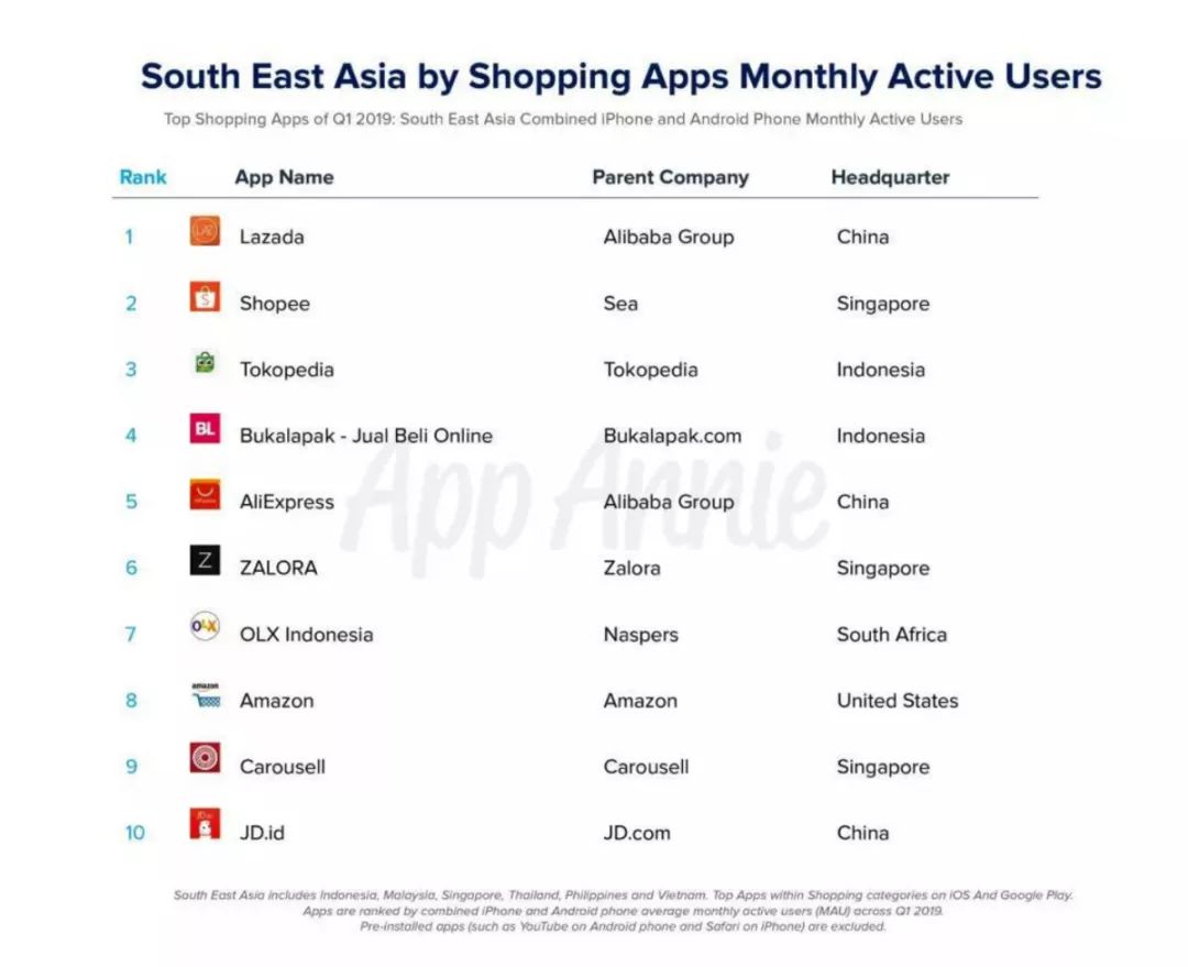 Lazada 成为2019年 Q1 东南亚排名第一的购物应用。据 App Annie 数据显示,截止2019年第一季度,Lazada 成为东南亚地区购物网站月活跃用户数最多的公司。Lazada 在菲律宾、马来西亚、泰国和新加坡位列榜首,在印尼和越南则分别位列第四和第二位。腾讯支持的 Shopee 则在越南排名第一,在印尼、泰国、菲律宾和马来西亚位列第二。和上一季度相比,Lazada 的流量增长了5%,达到1.844亿次。