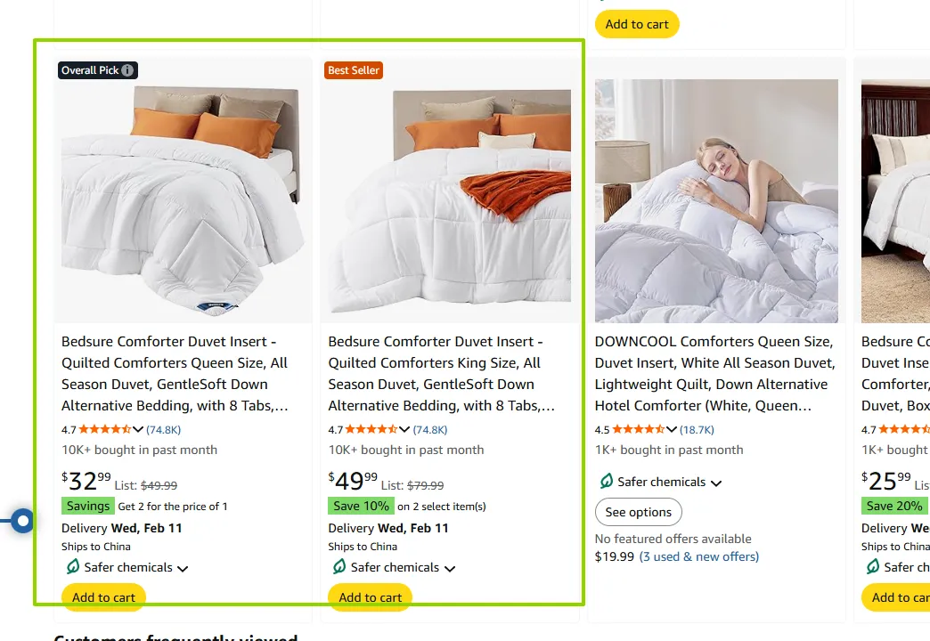 在“Bedspread Comforter Duvet Insert”等热门关键词的搜索结果中,同一父体下的不同子体产品已经能够占据2-3个自然位置,形成了直观的“多坑位”展示效果。